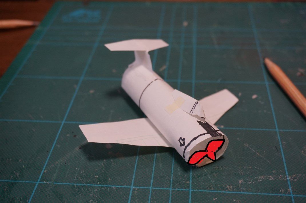 発泡素材で円筒を作り中にモーターとプロペラを収めてジェット機のように見えます。