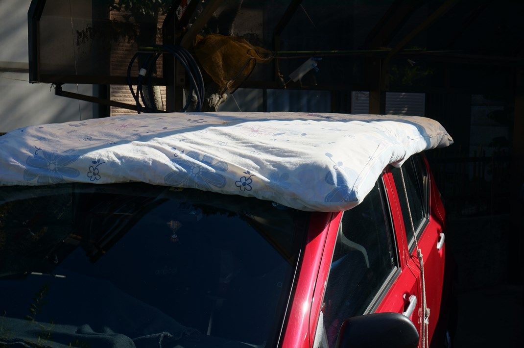 車の屋根を掃除してから、自分の布団を車の上で干しました。風は弱いですが念のためロープで縛ってあります。(ベランダでは息子の布団を干しました。)
