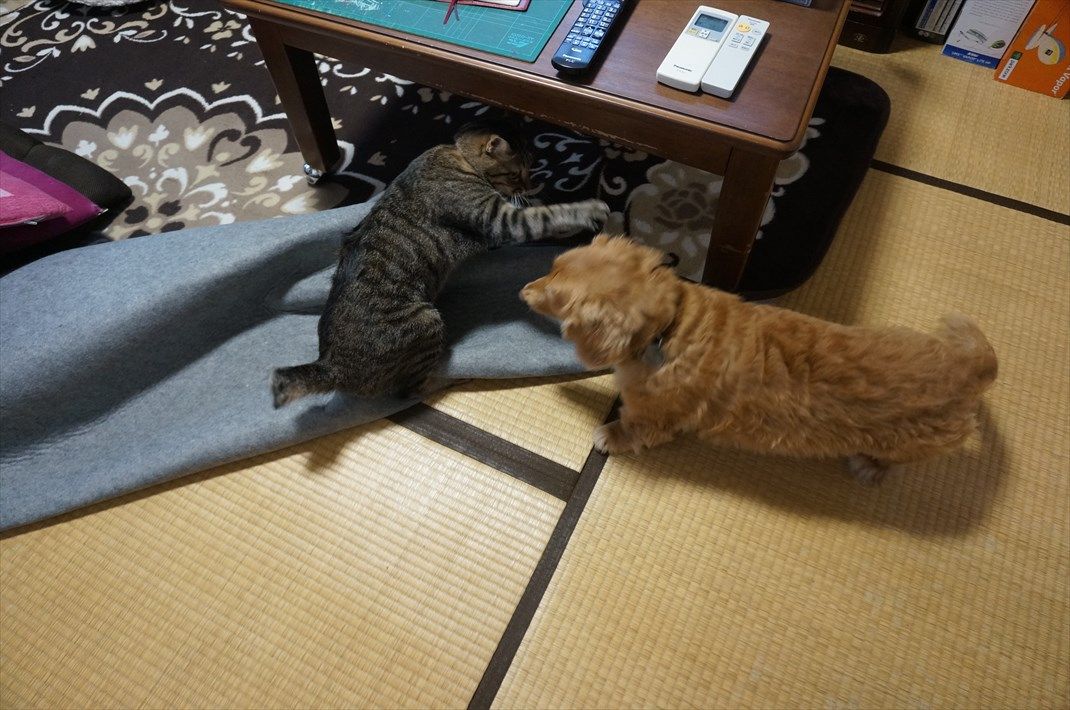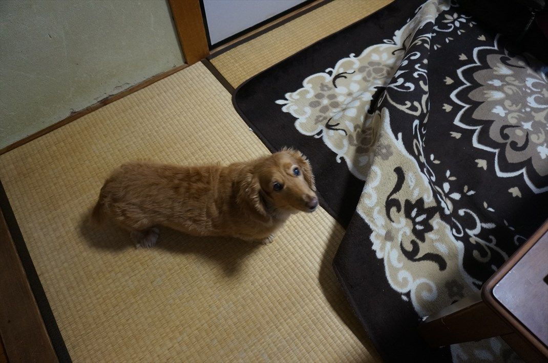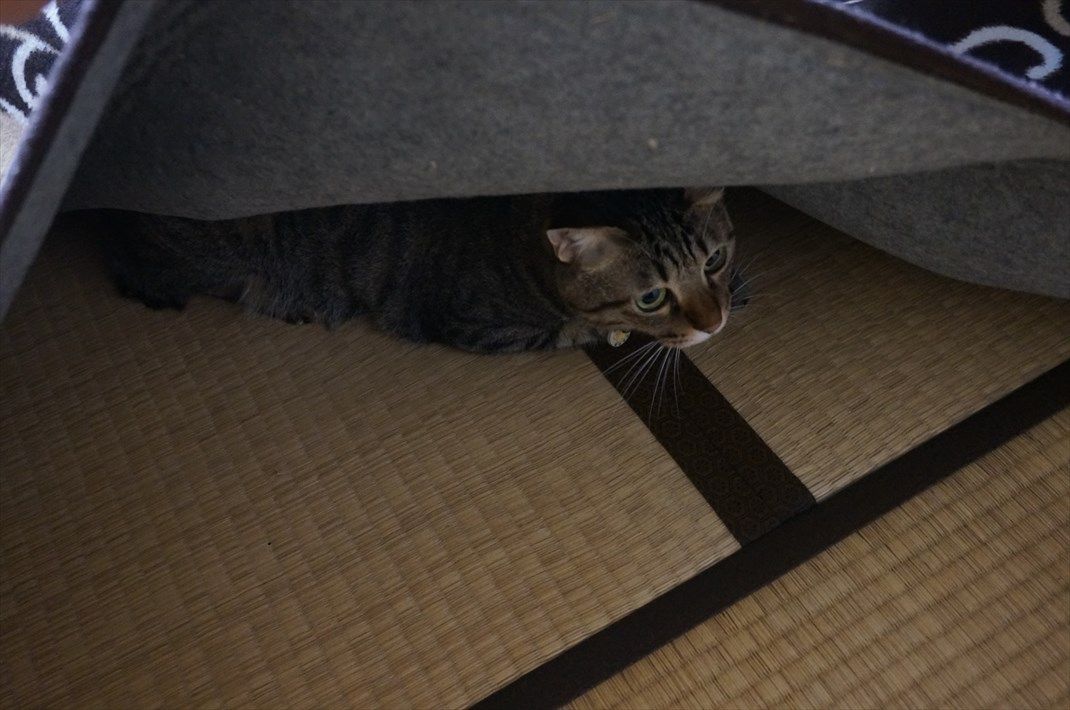 カーペットが膨らんでいる辺りにソラニャンが隠れています。