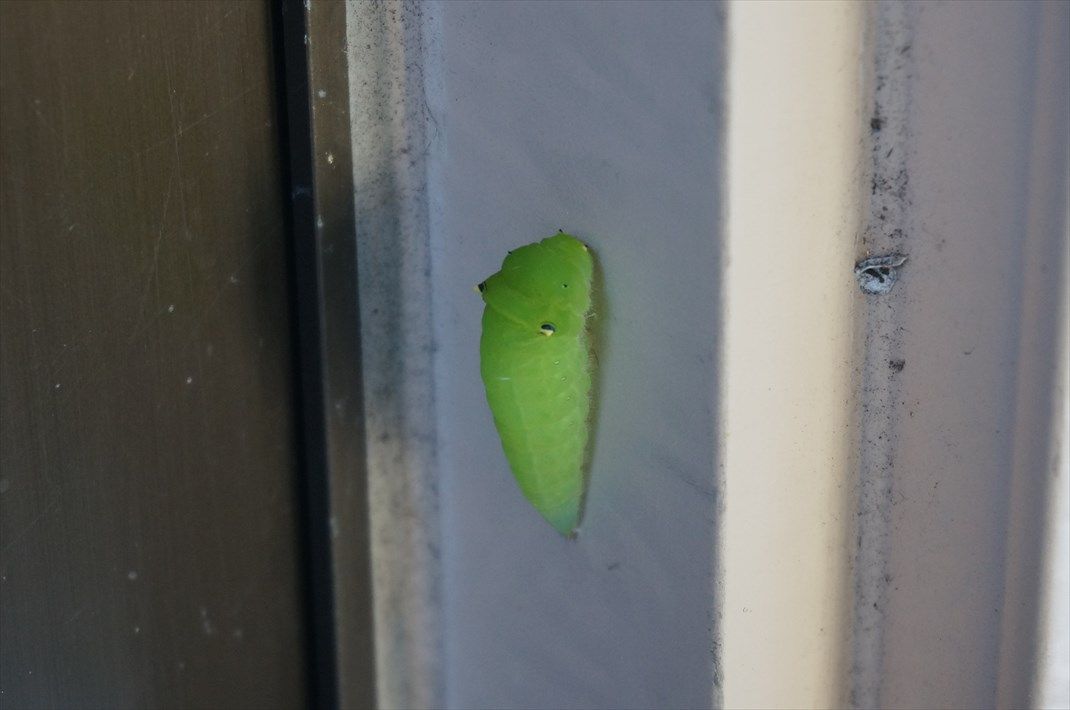 昨日、玄関脇にとまっていたアオスジアゲハの幼虫は、サナギに変身しつつあります。