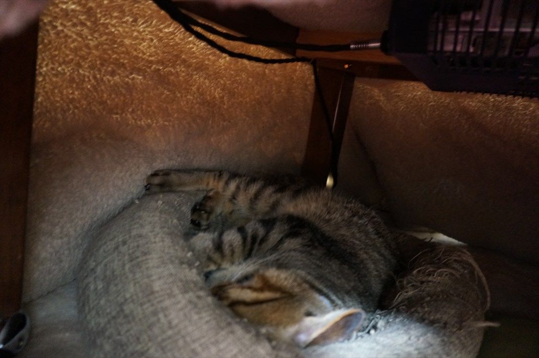 ホットカーペットの熱でネコベッドが下から暖まっているのでソラニャン気持ち良さそうに寝ています。