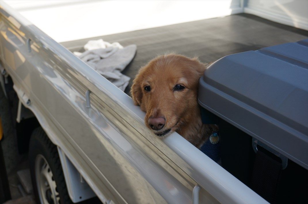 荷物を車から降ろす間、レオワンには、軽トラの荷台に居てもらいました。