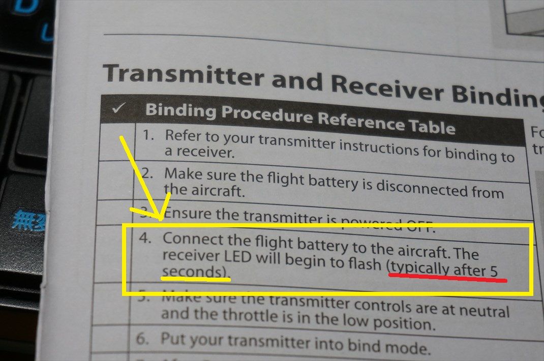 フライトバッテリーを航空機に接続します。 受信機のLEDが点滅し始めます。 ​(通常は5秒後。)​