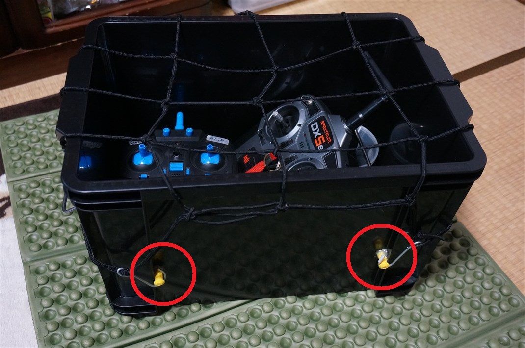 コンテナに100均ネットのフックを引っ掛けられるよう、赤丸のところにプラパーツ(ラジコン用を流用)を接着しました。結構しっかりとくっつきますね。