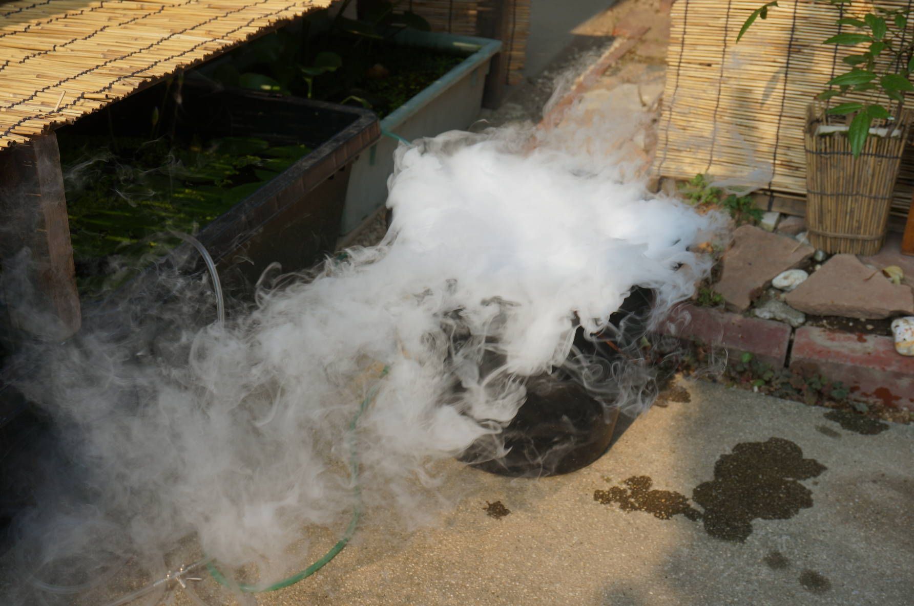 フルーツタルトアイスに入っていたドライアイスを外に置いてあるバケツに投入しましたが、この暑さですぐに無くなってしまいました。