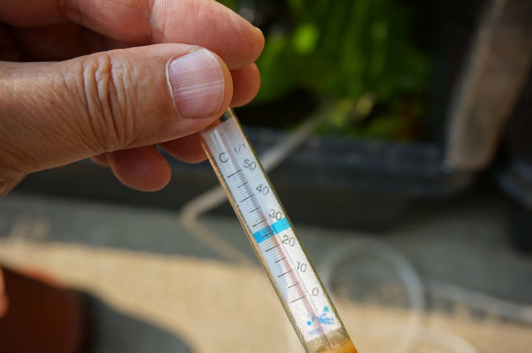 メダカ水槽の水温は34度。 僅かですが日除けの効果があるようです。