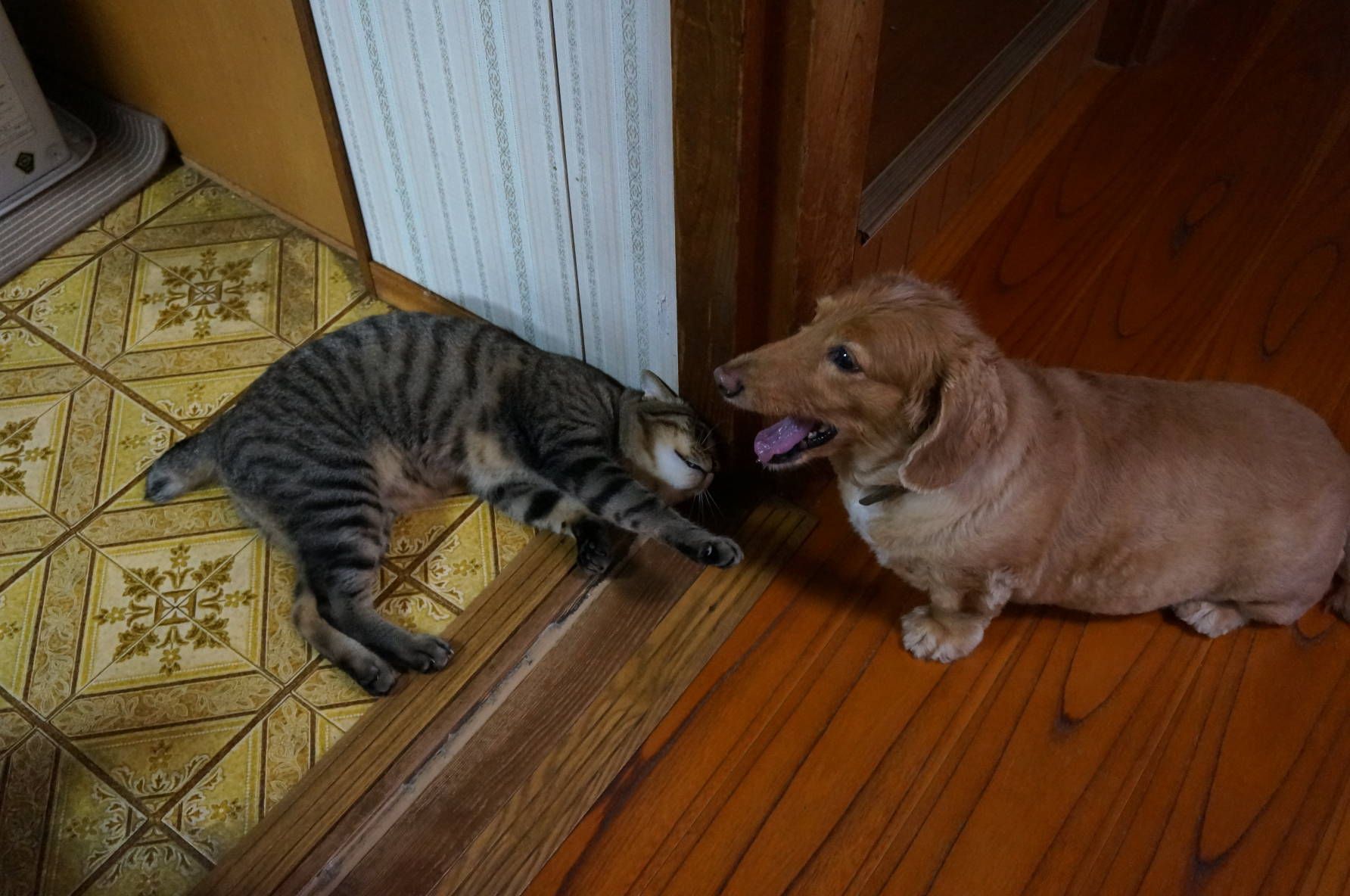 あくびしているレオワンにソラニャンがちょっかい出そうとしています。