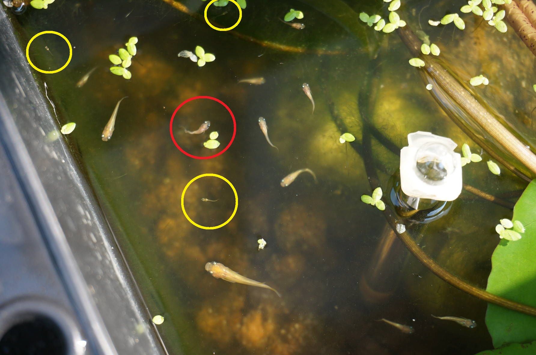 赤丸のメダカは、尻尾が曲がっているので長生きできないかも?