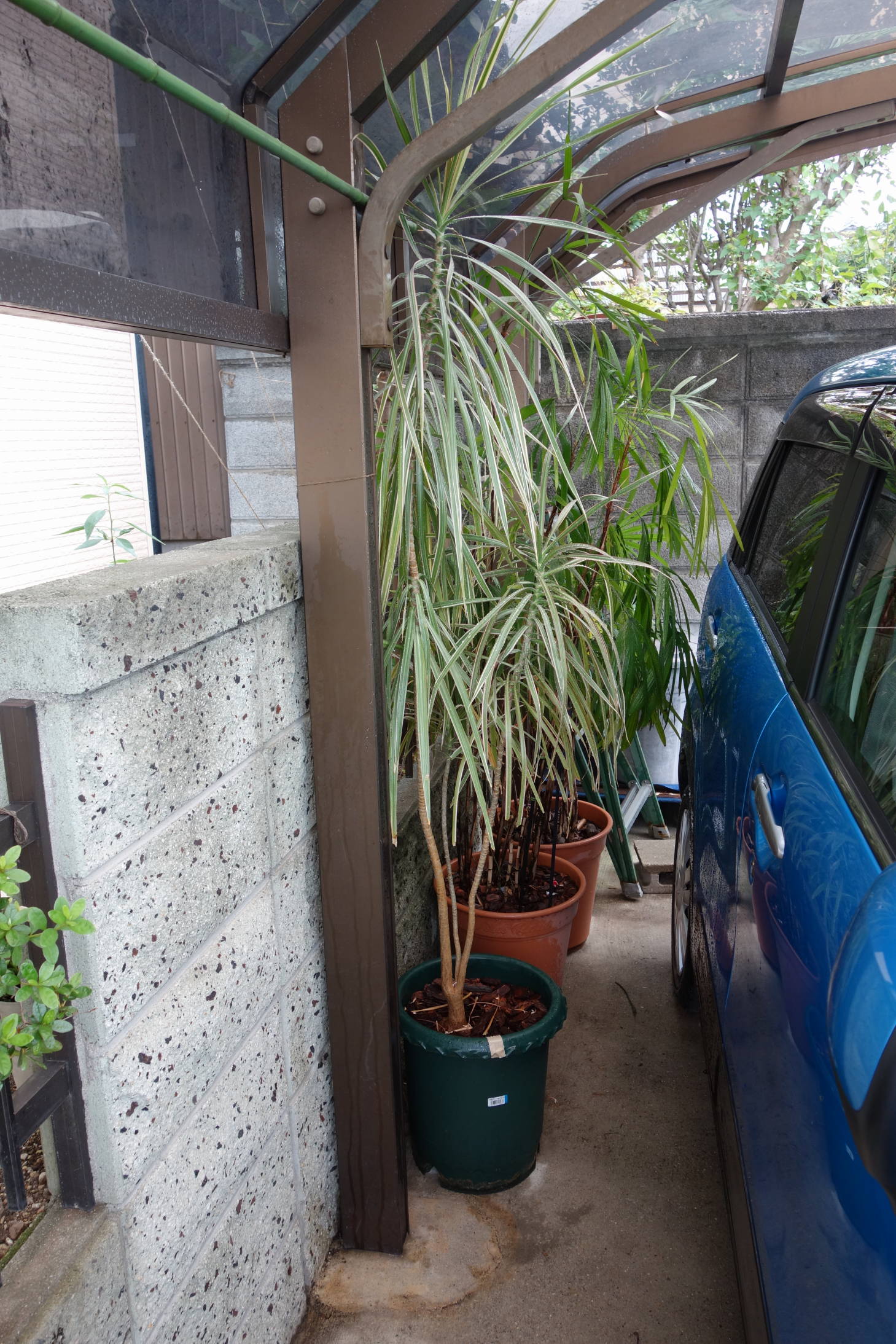 朝一番で室内の観葉植物(夾竹桃と写真手前の植物)を駐車場に移動しました。