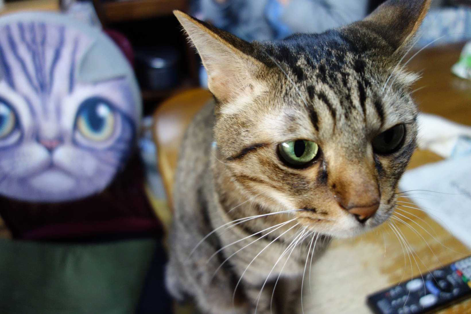 ソラニャンの左に見える猫は、お母さんが台所で使っている事務椅子の背もたれに付けたクッションです。