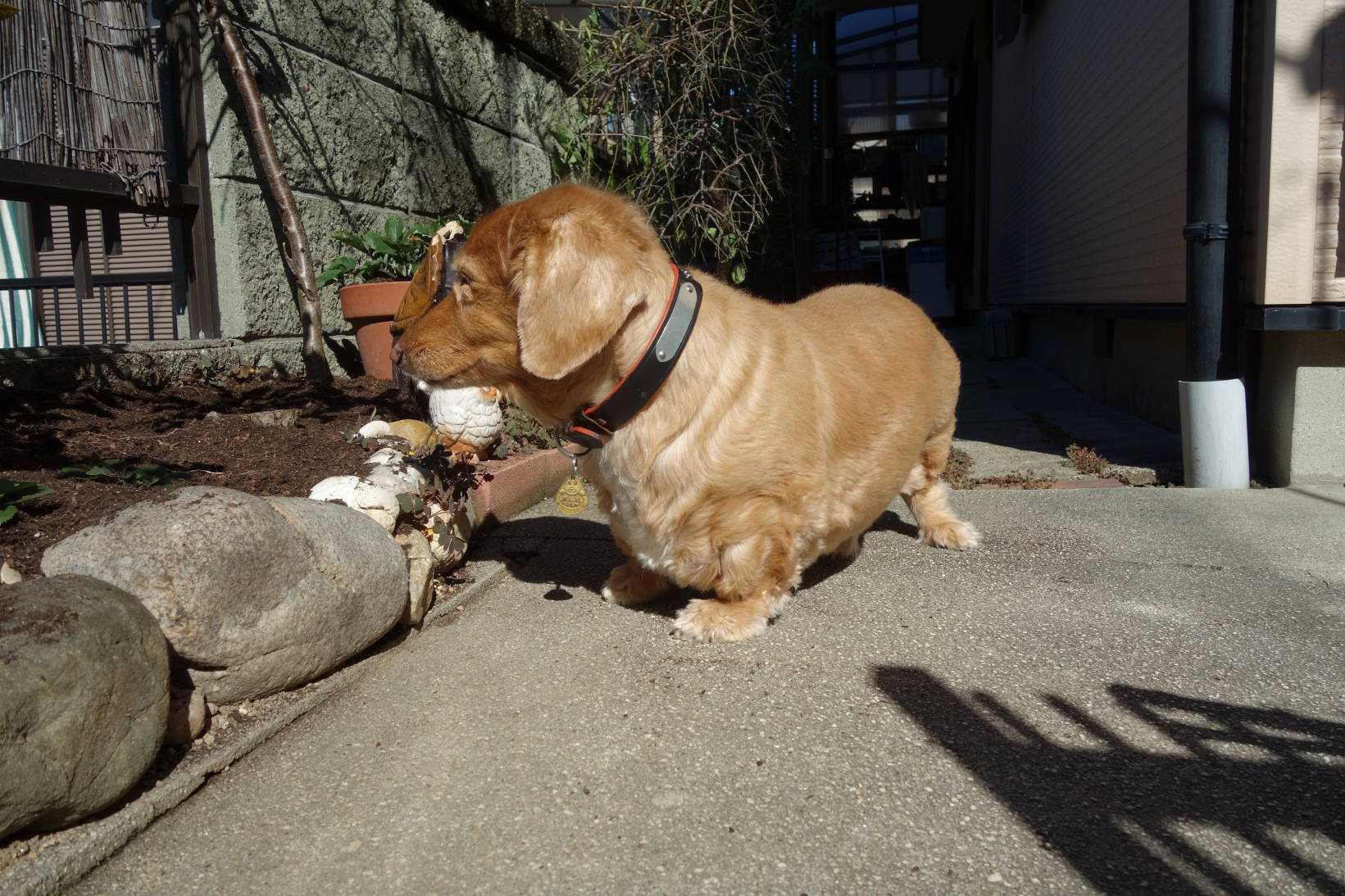 作業中レオワンを庭に出して日光浴させましたが、すぐに玄関の方に帰って行きました。