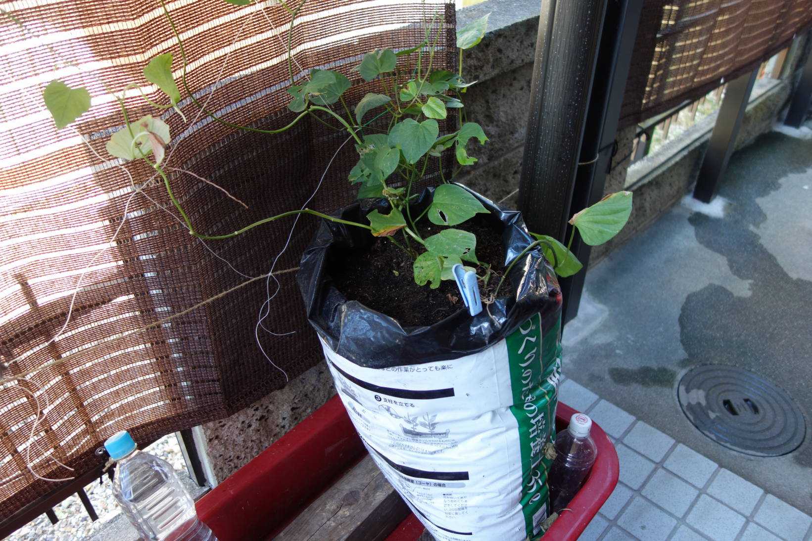 7月初めに芽が出たサツマイモの切れ端を培養土袋に埋めました。(2袋)