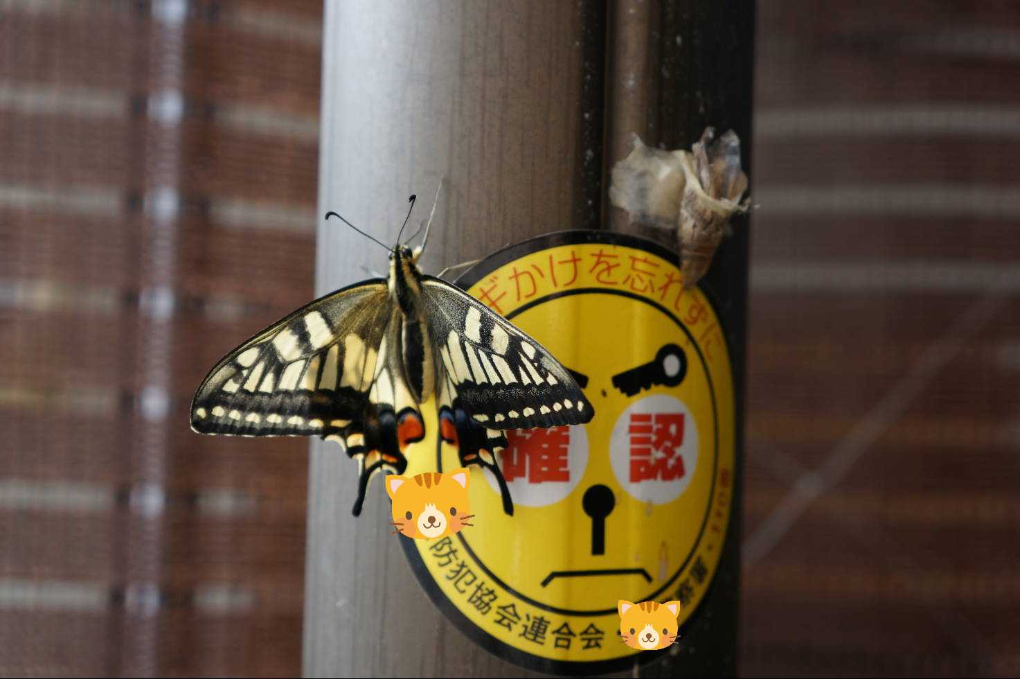 その後、9月半ばに室内にサナギを持ってきて羽化するのを待ちましたが、ちっとも羽化する気配がないので玄関先の柱にテープで留めて置きました。