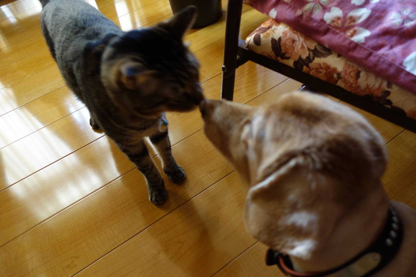 コタツから出てきたソラニャンとレオワンが出くわしました。