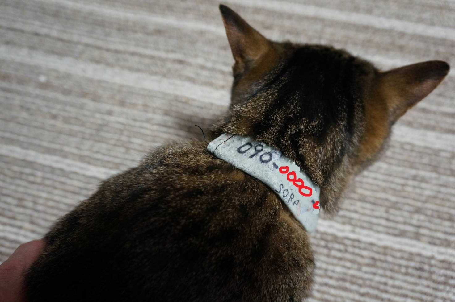 油性のネームペンで携帯の電話番号とソラニャンの名前を書きました。