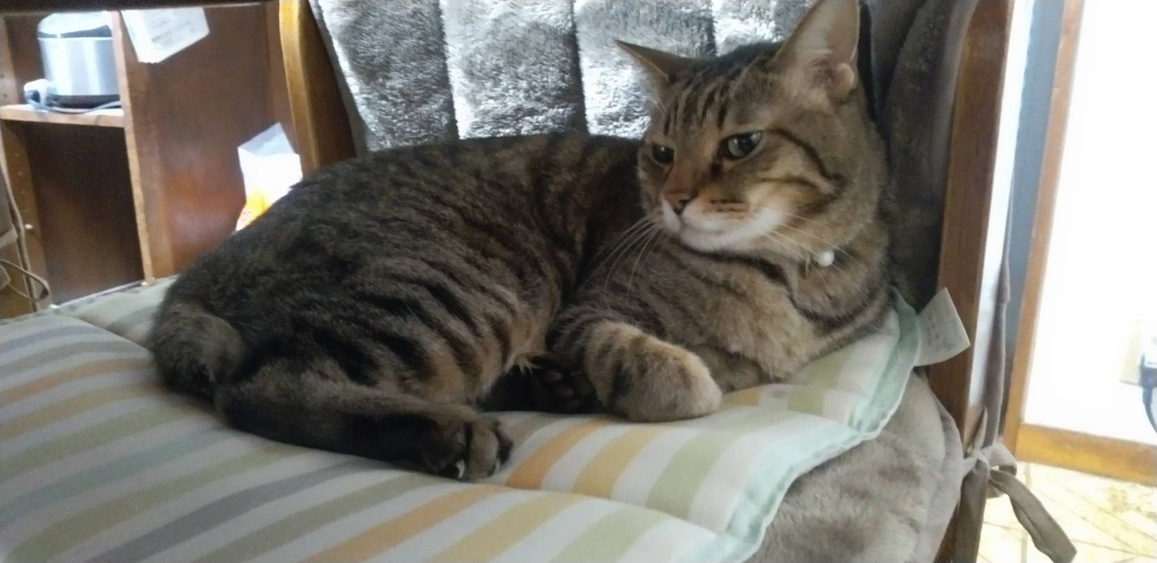 お母さんと一緒に暖かい台所の椅子の上でくつろいでいます。