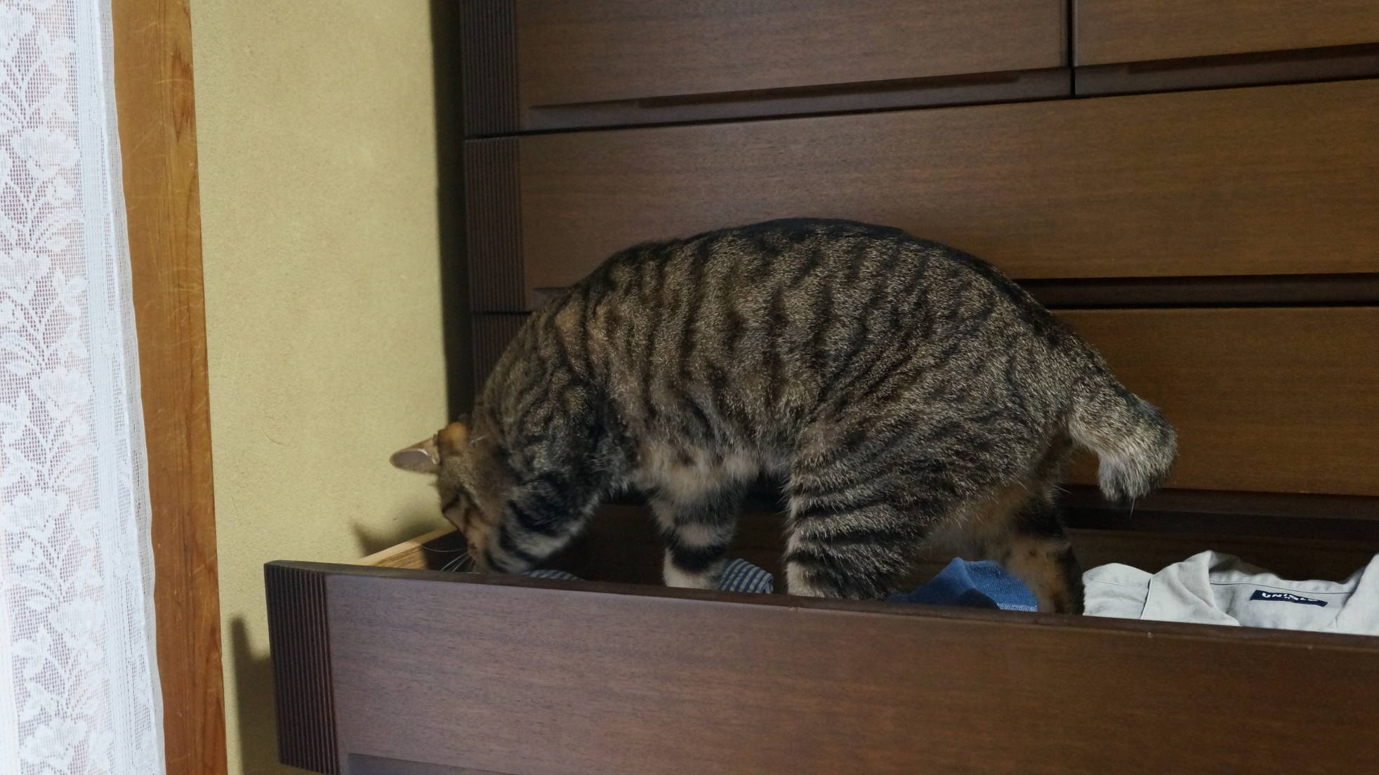 タンスの引き出しを開けて衣類の整理をしていたら、ソラニャンがやってきました。