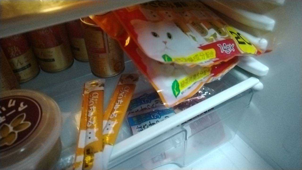 ソラニャンのおやつのチュールを台所の棚から冷蔵庫に移しました。