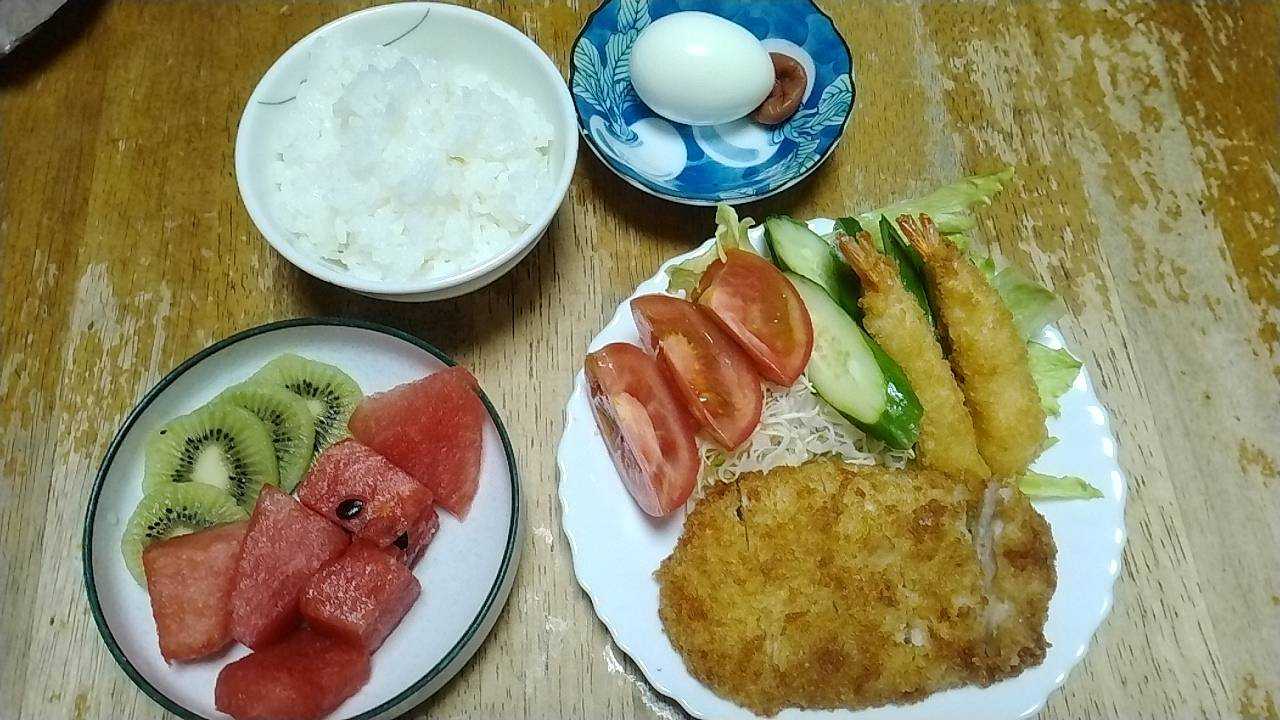 エビとカツは生協の冷凍品。 茹で卵は今回も綺麗に殻が剥けました。