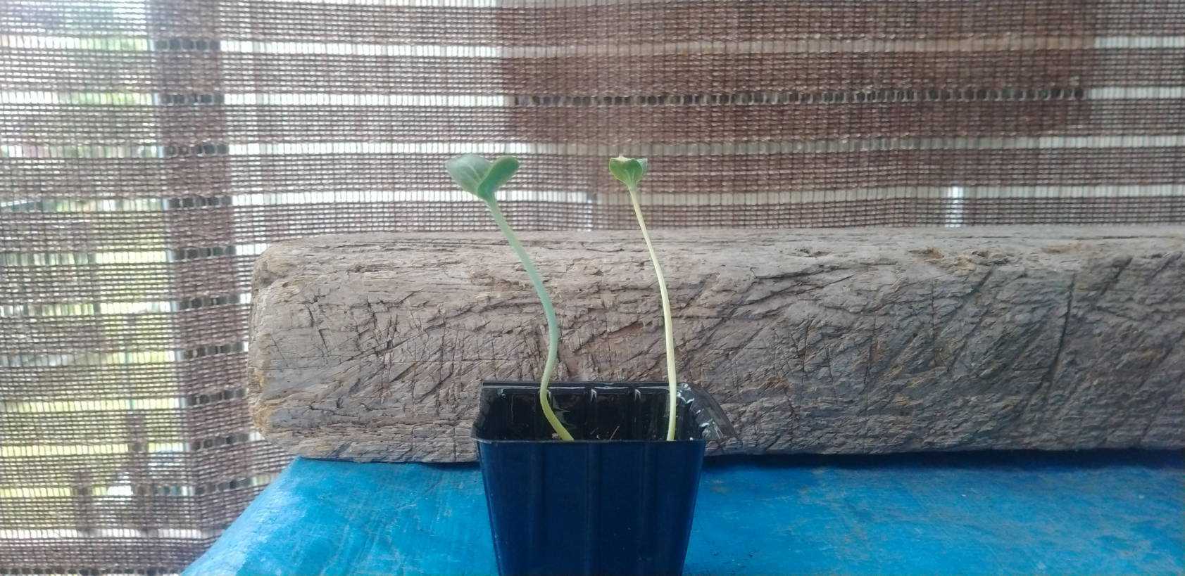 スイカの芽は、ひょろひょろと伸びて先端の双葉が開きました。