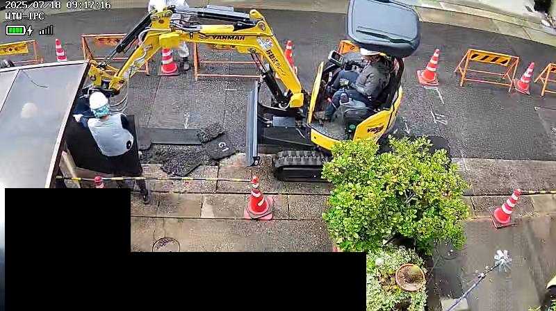 仮舗装のアスファルトとコンクリ舗装部をひっぺがしているところ。