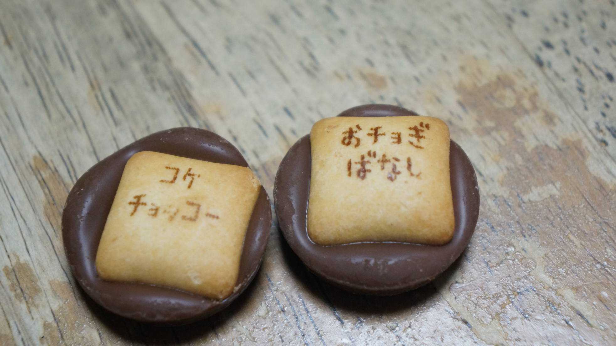 チョコとビスケットのお菓子で、ビスケットにチョコのダジャレ?が書かれています。