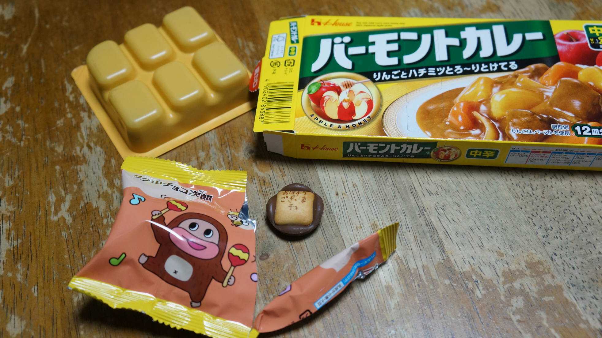 お菓子の袋は、”サク山チョコ次郎”という名前のお菓子です。