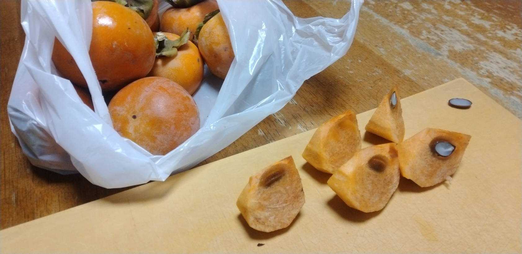 ご近所さんが自宅の庭で採れた柿を持って来てくれたので、さっそく一つ頂きました。