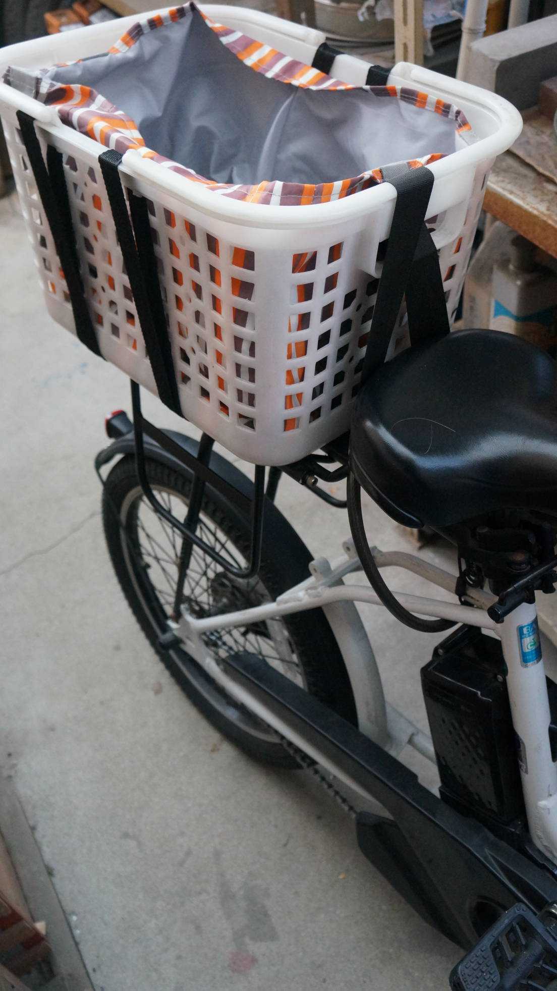 自転車の籠を撤去してなんちゃってサイドバッグを付けましたが、物があまり入らないので元の籠に戻しました。(レタスなどかさばる野菜だとなんちゃってサイドバッグでは容量的に厳しいです。)