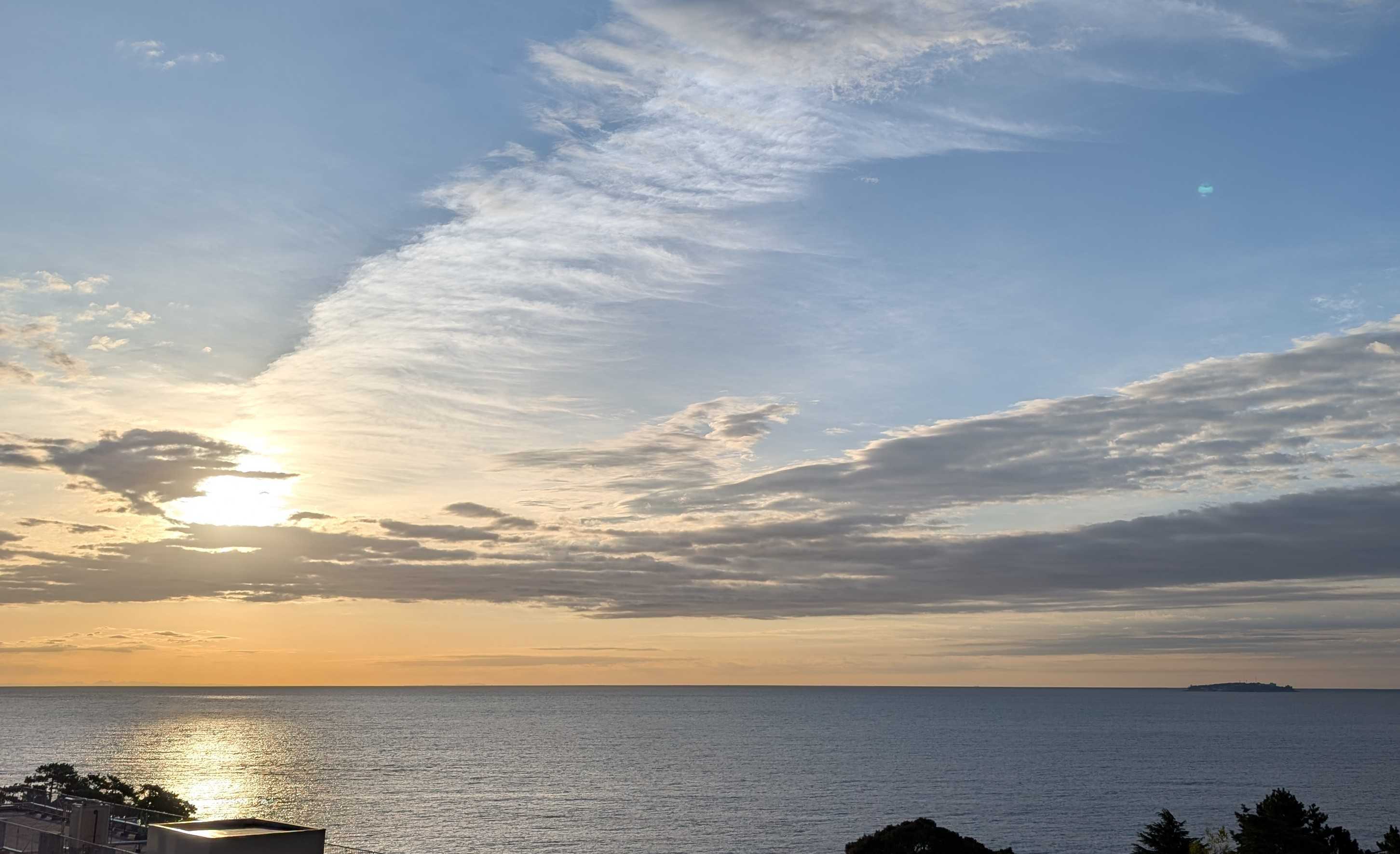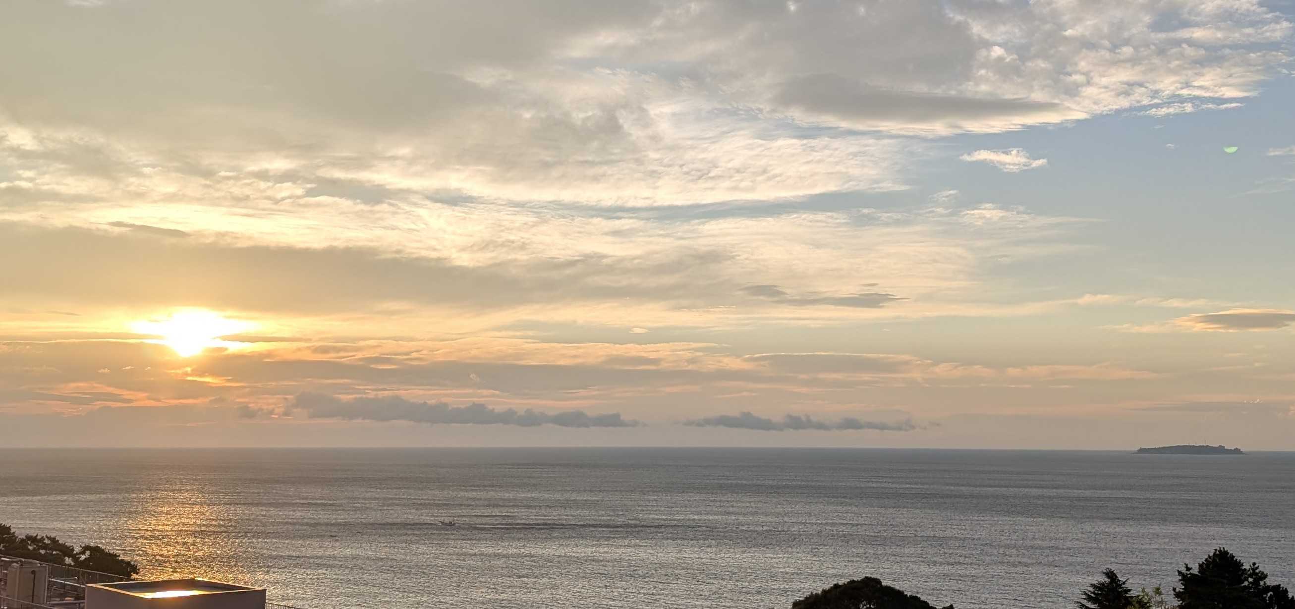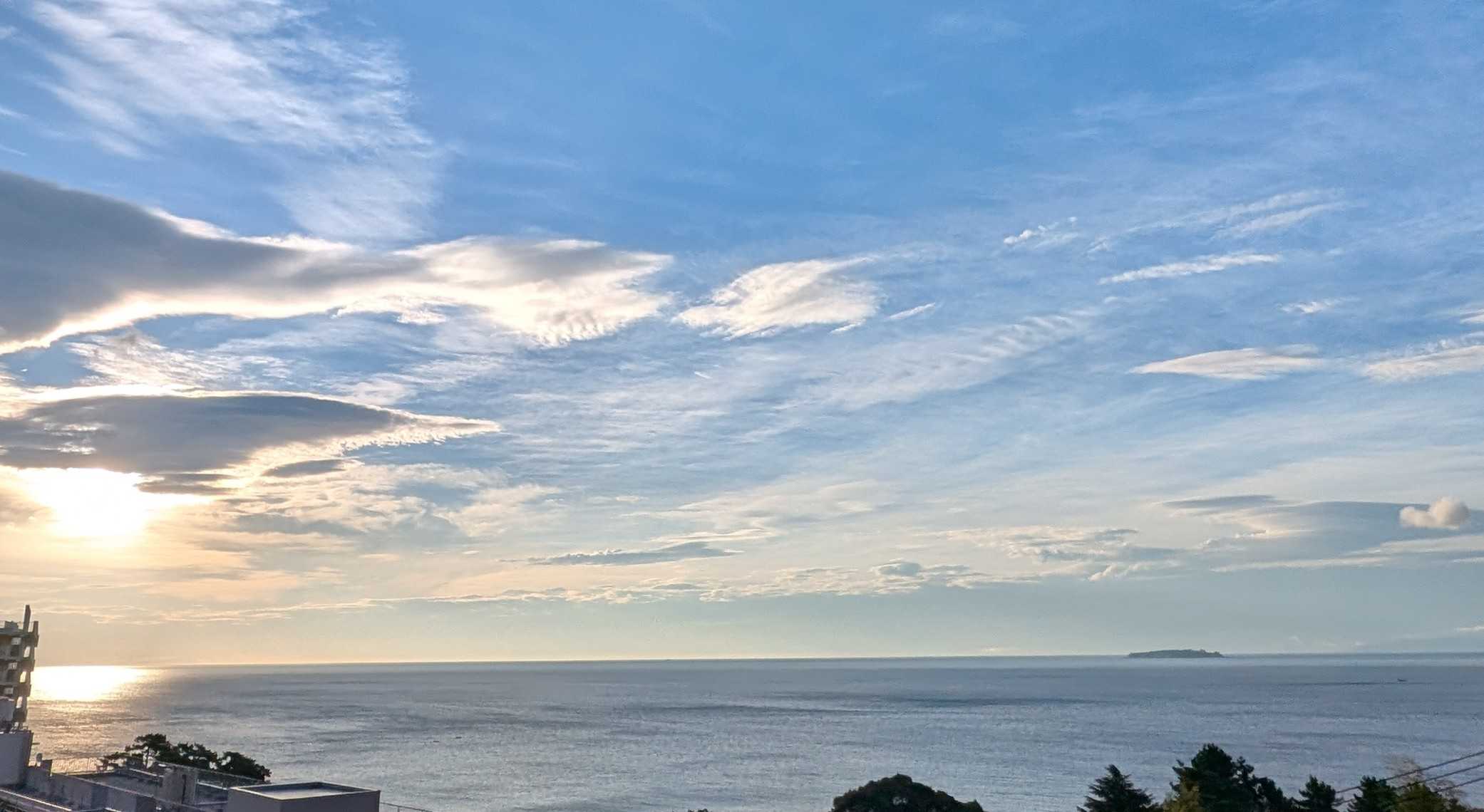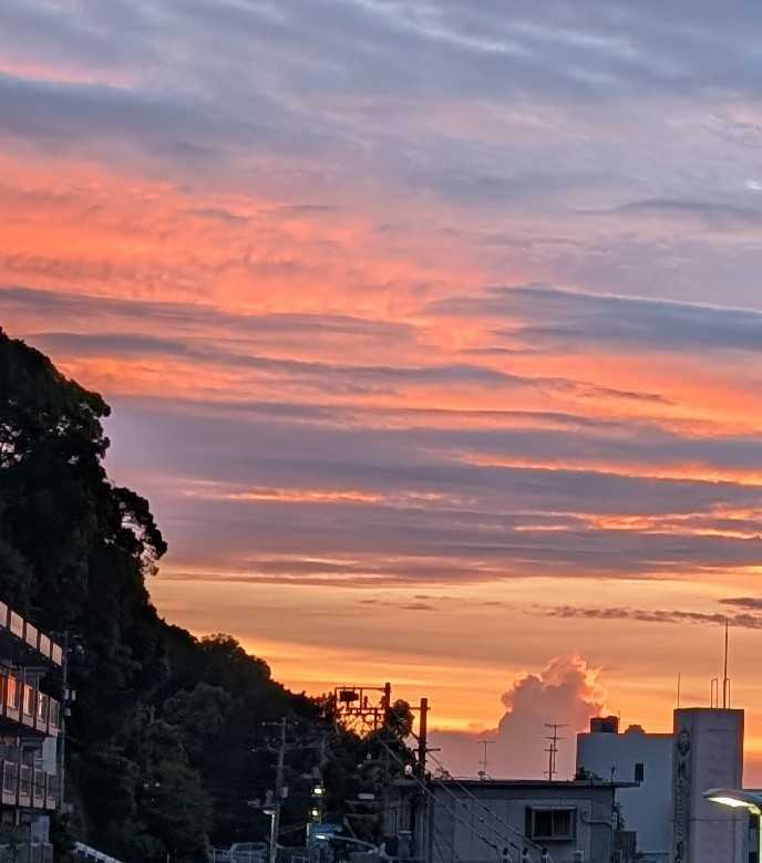 早朝の熱海の空と海です。日の出が遅くなりました。時間が経つにつれ、風が強く湿度も上がってきます。昨日は洗濯日和と思って、あたしはたくさん洗濯して干しました。シャツなどの生地の厚い襟の部分の乾きがイマイチでした。熱中症アラートが出ているくらい暑くても風が強くても湿度が高いと洗濯物の乾きが悪いですね。人の身体にはもっと悪い影響があるような気がします。昨日今日と救急車が国道をよく走ります。これから気温が急に下がるようですね。朝起きたら、心配なんですけど。膝から下が痛くて堪らない!!なんてことにならないように!と言ってどう気をつけたら良いのでしょう?困りましたね予報はただの数字で体感は人それぞれですからね。