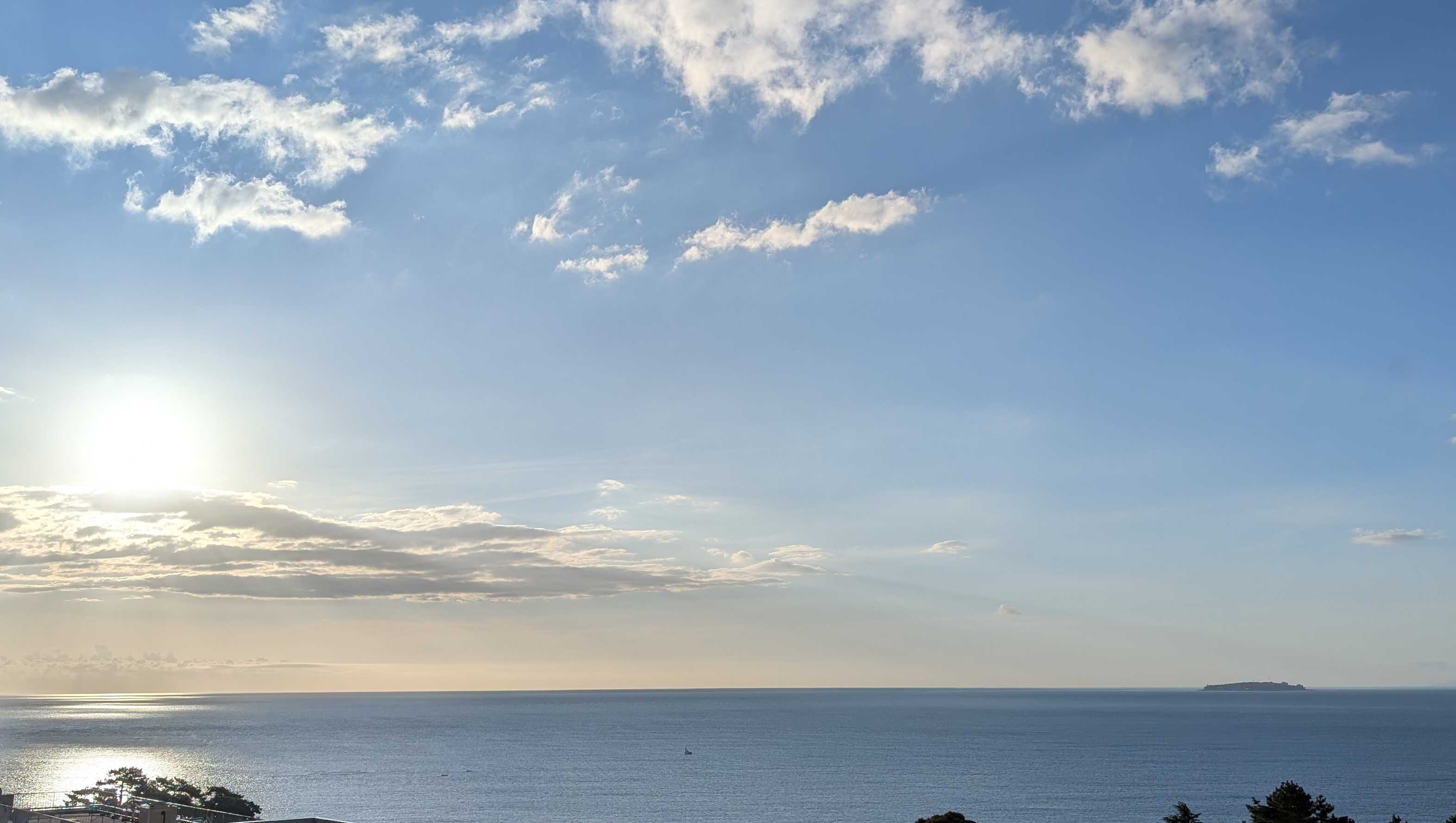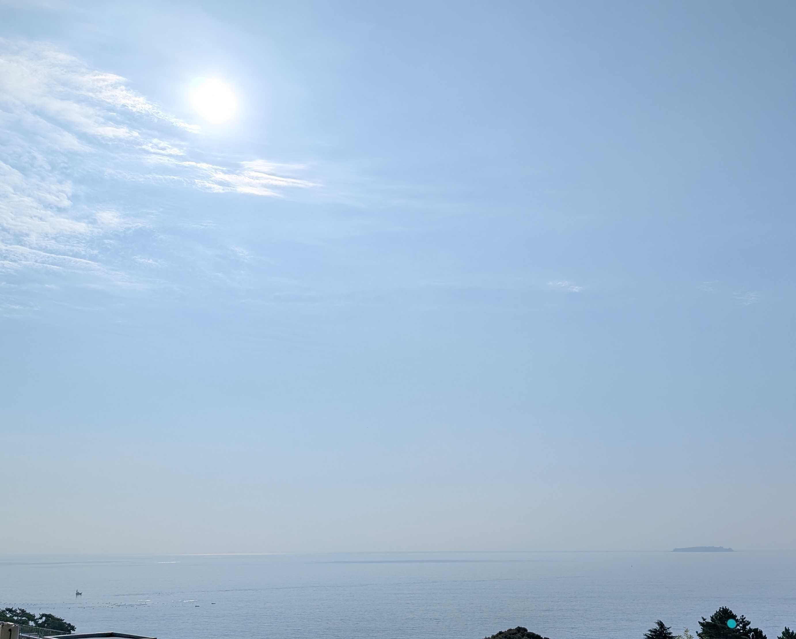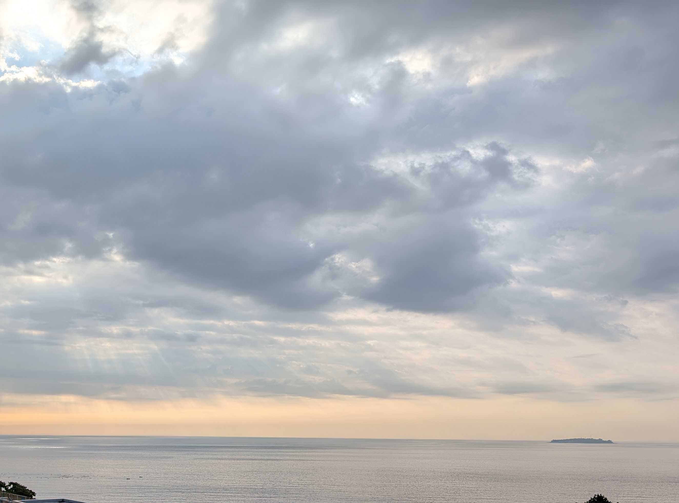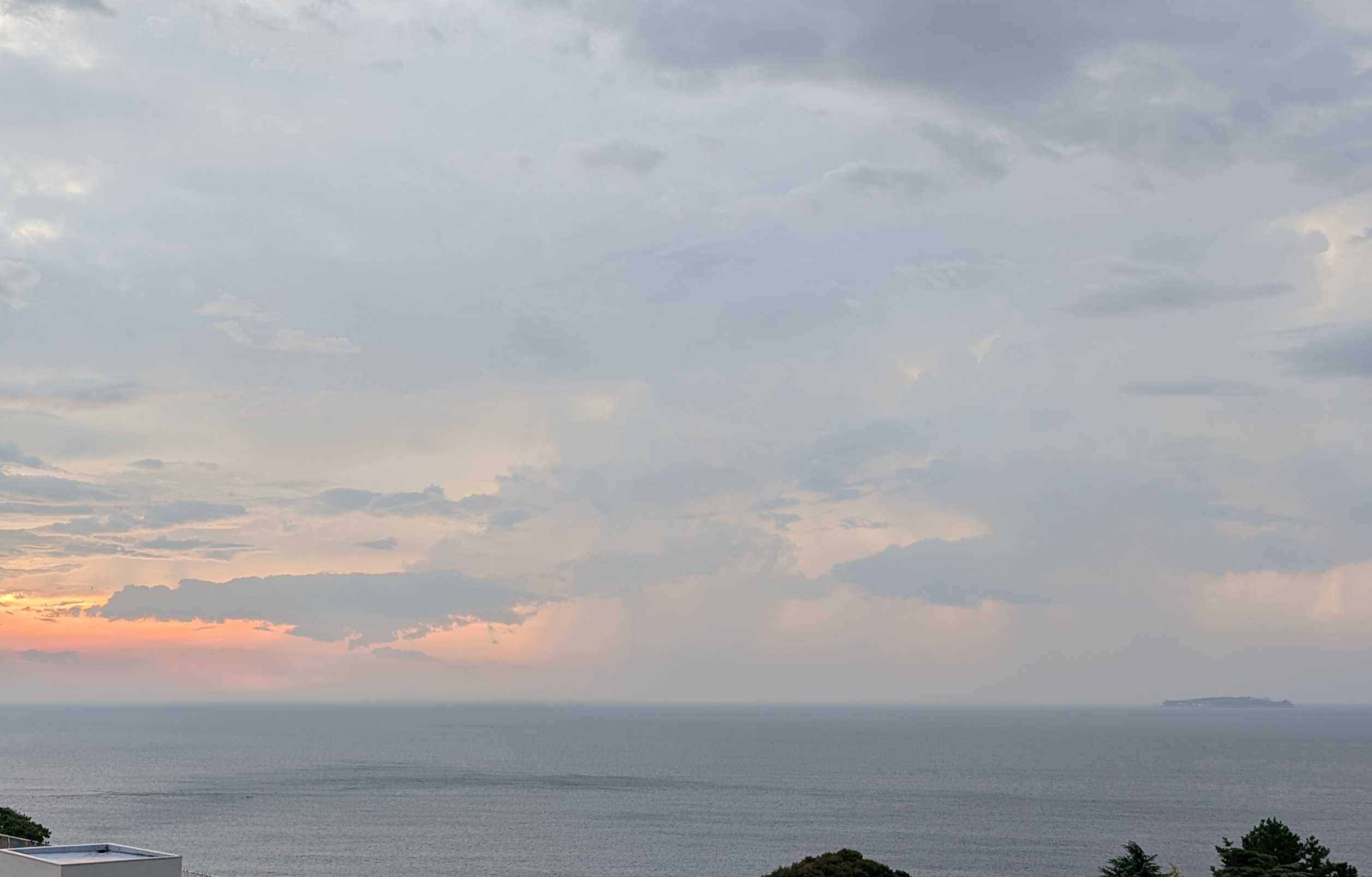 おはようございます。これは我が家のコンロです。今朝、あたしはこのコンロにキャベツのカケラを落として爪楊枝で取ろうとしました。頑張って、頑張って~~受け皿の下の穴から両方ともその下に落ちてしまいましたとても自分ではこれ以上無理!!電源を落とそうにも手が入らなくて、分解なんて出来ません。管理人さんに言ってマンション出入りの電気業者に電話しました。受け皿の下には配線が入っているので、そのまま放置しても良いとか。昨夜の熱海の空と海です。左下にぼんやりと白い船が。海上保安庁の船です。今朝もまだいます。