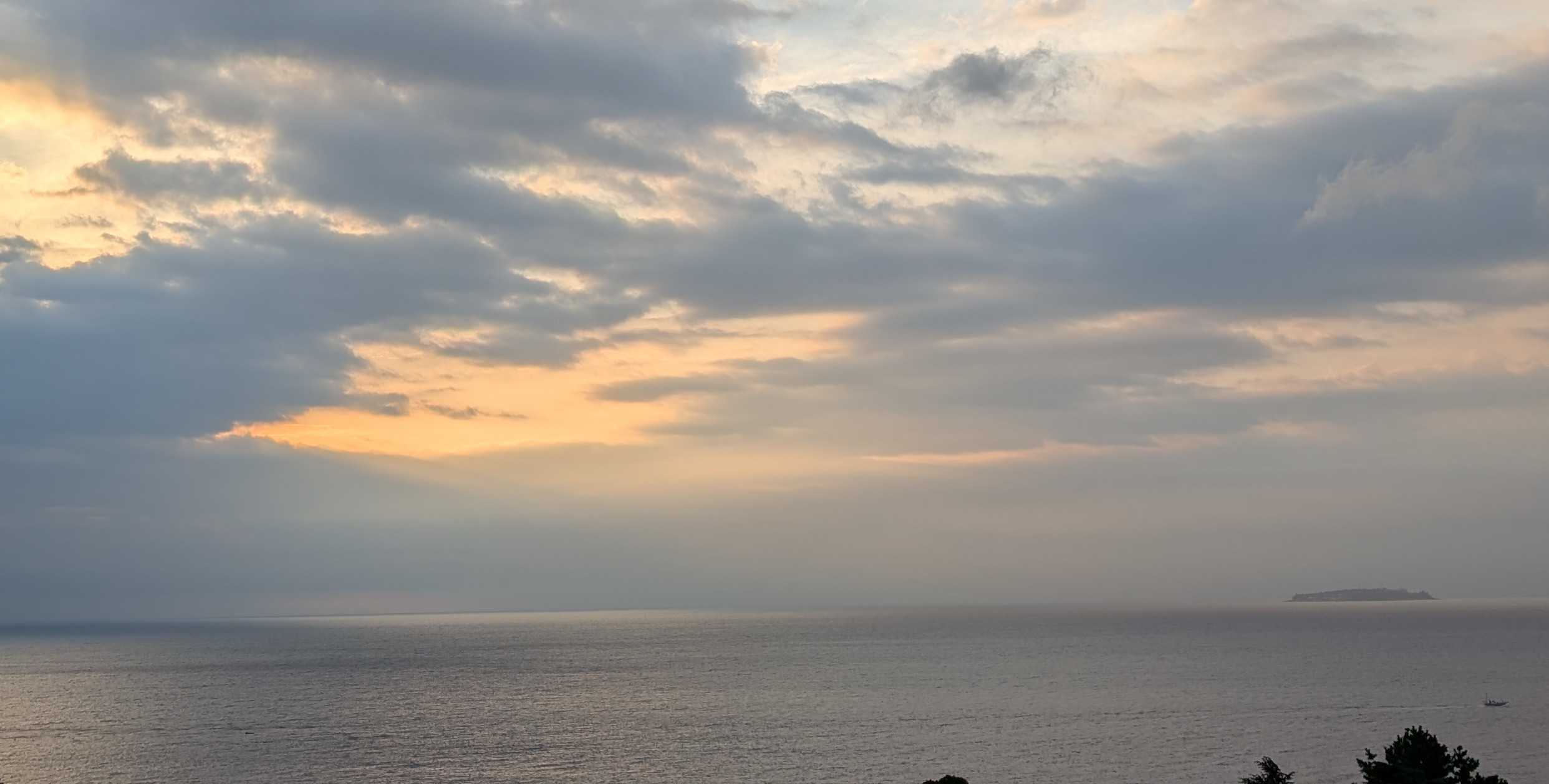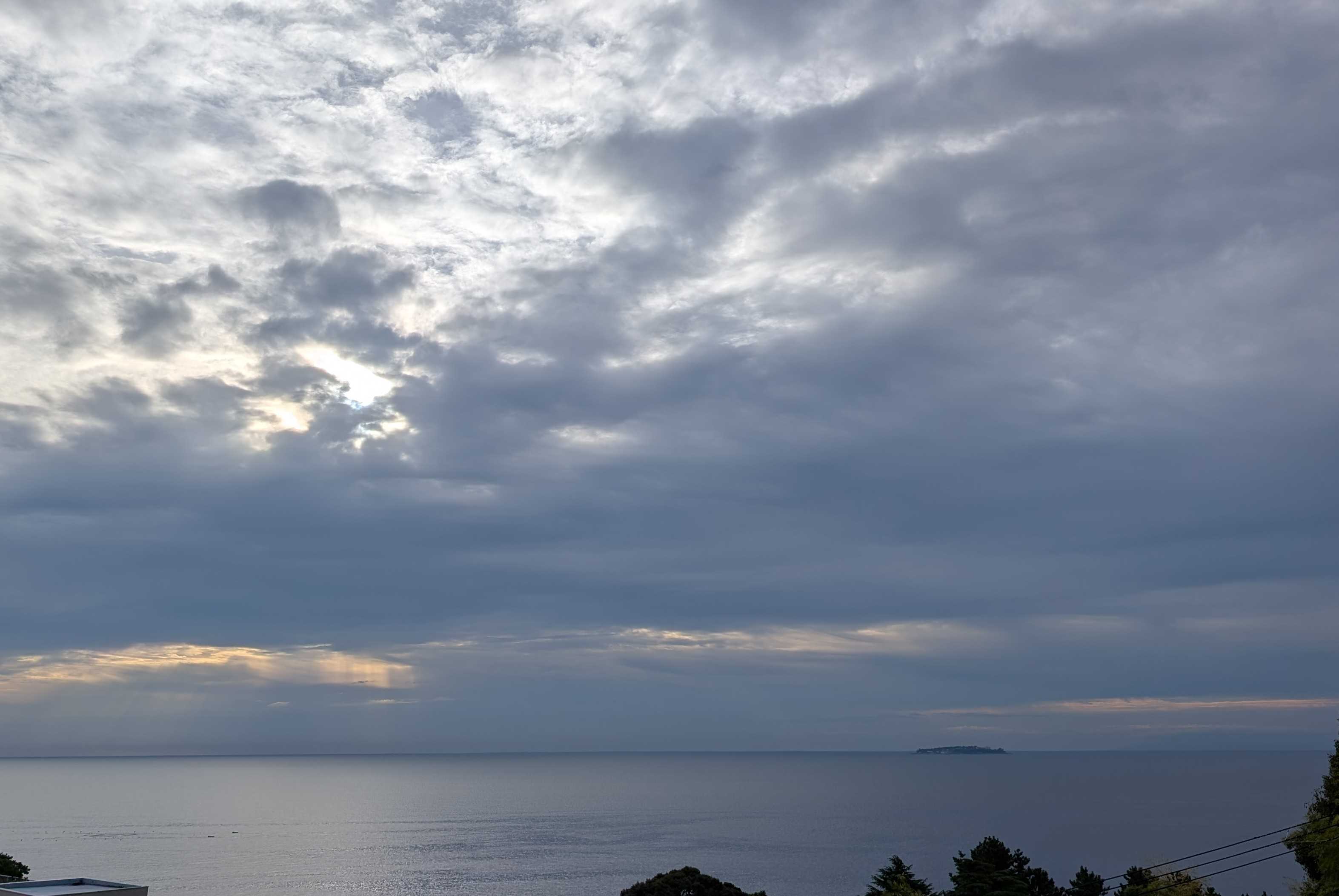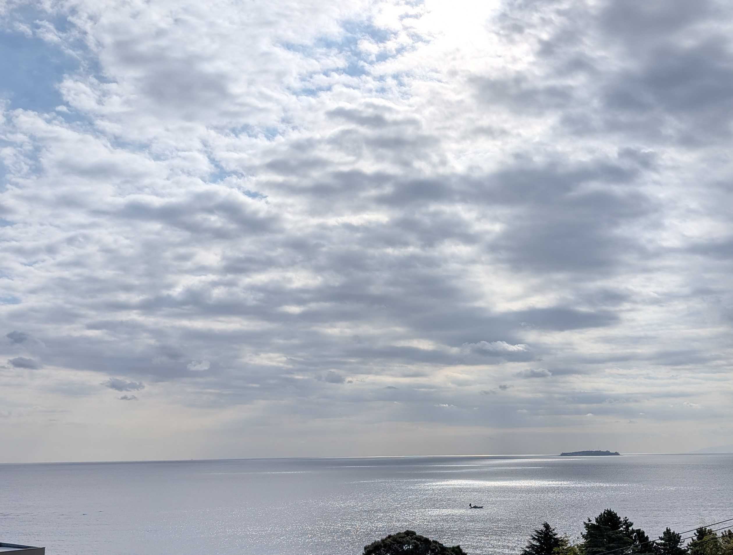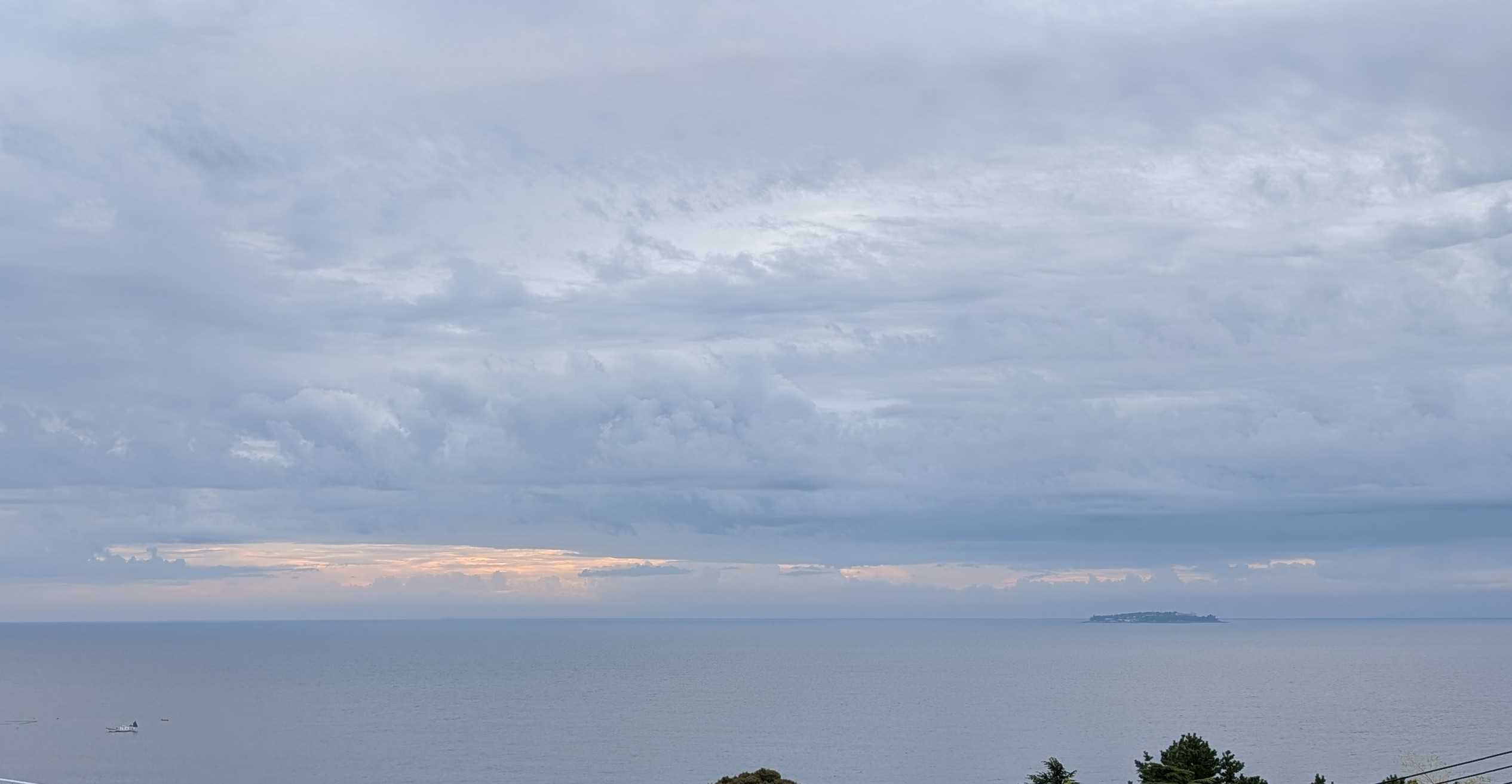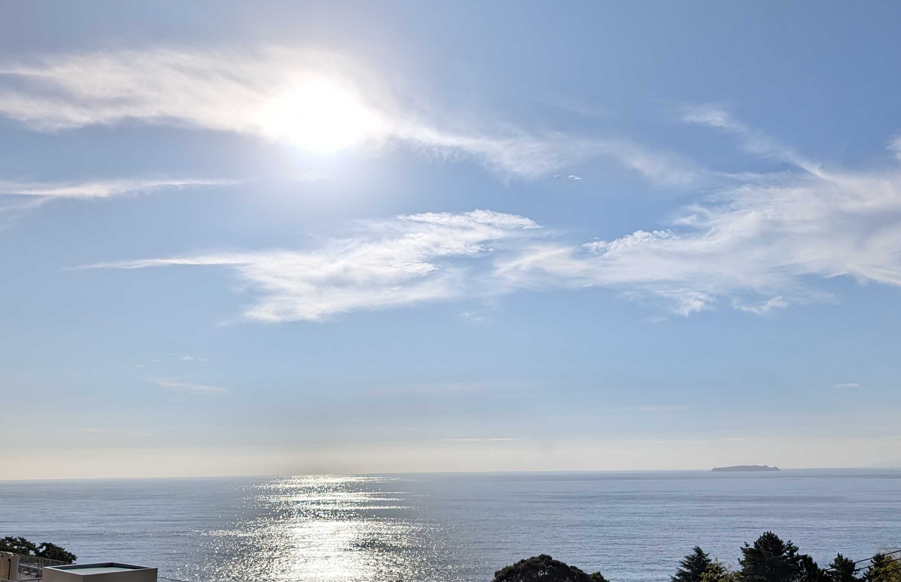 おはようございます。これは我が家のコンロです。今朝、あたしはこのコンロにキャベツのカケラを落として爪楊枝で取ろうとしました。頑張って、頑張って~~受け皿の下の穴から両方ともその下に落ちてしまいましたとても自分ではこれ以上無理!!電源を落とそうにも手が入らなくて、分解なんて出来ません。管理人さんに言ってマンション出入りの電気業者に電話しました。受け皿の下には配線が入っているので、そのまま放置しても良いとか。昨夜の熱海の空と海です。左下にぼんやりと白い船が。海上保安庁の船です。今朝もまだいます。