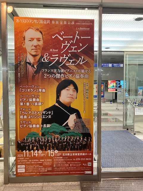 石川県立音楽堂のコンサートホールが休館になったのにともない、邦楽ホールで特別定期公演が開催されることになりました。パイプオルガンのオーバーホール(分解点検修理)に伴う 石川県立音楽堂のコンサートホール休館のお知らせこの日はその第1回。購入したチケットは、前から7列目。ピアノのスマンさんの手元がよく見えました。音楽祭のときにはこの距離感で聴いたことがありましたが、「特別」とはいえ定期公演では初めて。前のほうで楽団員さんの表情などが見られる席も好きです。(値段が高いという理由で、ふだんは後方で聴いている)1曲目で、指揮の岡崎さんがタクトを落とした瞬間も見ることができました。どの曲もとっても楽しめました。2回目以降にも期待です。----------------------------指揮 岡崎 広樹ピアノ アルフォンス・スマン*コンサートマスター アビゲイル・ヤングベートーヴェン「コリオラン」序曲 op.62ベートーヴェンピアノ協奏曲 第1番 ハ長調 op.15*(休憩)フォーレ「ペレアスとメリザンド」組曲 op.80 よりシシリエンヌラヴェルピアノ協奏曲 ト長調*~アンコール~ソリストアンコール ヒナステラ アルゼンチン舞曲集よりオーケストラアンコール ドビュッシー 小組曲より第4番「バレエ」----------------------------