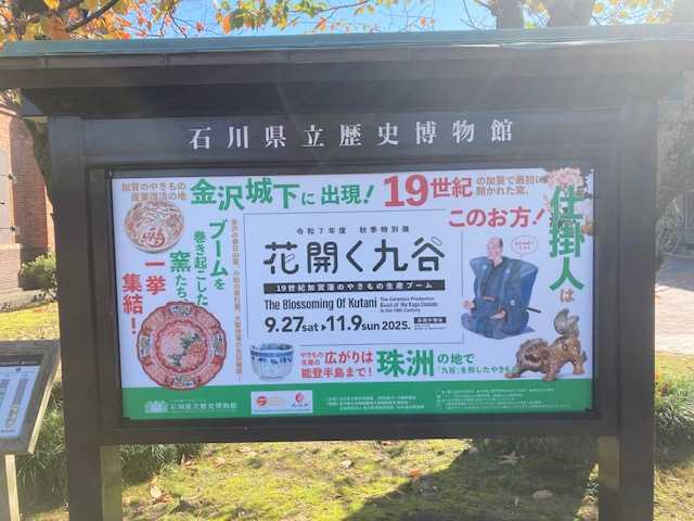 チラシを見て「おもしろそうだ、観に行かなくては!」と思っていたのですが、結局、会期ギリギリになってしまいました。【概要】江戸時代前期から中期にかけて、日本列島における陶磁器の生産は限られた地域にとどまっていました。このころの前田氏の領内では、17世紀という全国的にも早い段階で色絵製品を含む磁器を生産していた九谷古窯(くたにこよう)が知られます。このほか、越中瀬戸窯(えっちゅうせとがま)などでも陶磁器が焼かれていましたが、生産地の大きな広がりは見られませんでした。それに対し、江戸時代後期には、技術の広がりや諸藩の産業振興策の影響により列島各地で数多くの窯が成立し、やきもの生産が行われるようになります。こうした流れの中で、加賀藩や支藩の富山藩・大聖寺(だいしょうじ)藩でも多くの窯が築かれます。今日、「再興九谷」と称される窯では色絵製品や日常生活用の陶磁器など幅広い製品がつくられ、やきものづくりの広がりは能登半島にまで及びました。本展では、それぞれの窯の作品に加え、窯跡や城下町遺跡からの出土資料、窯の経営にかかわる古文書などの多様な資料から江戸時代後期の加賀・能登での陶磁器生産の実態を明らかにします。令和7年度秋季特別展 花開く九谷―19世紀加賀藩のやきもの生産ブーム―