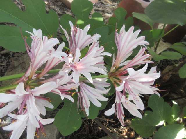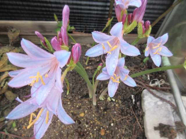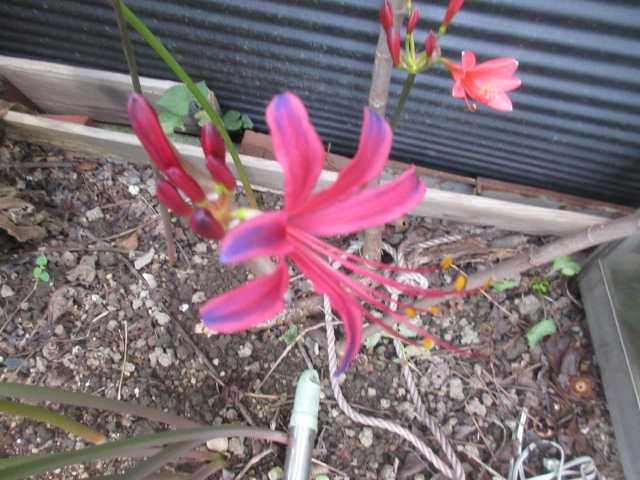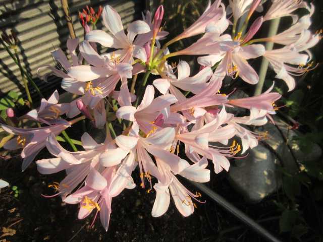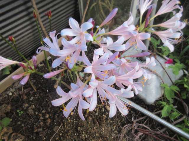 リコリスがにぎやかに咲いてきました。倒れて横向きになってしまったインカルナータ混じってきてしまいました。ウエキ2号キャサリンヒポキシスは長く咲いてくれます。