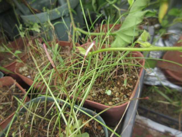 猛暑がつづきます。明日あさっては一時雨があるかも。でも暑い、しかも蒸す。そんな中、なんとか夏越しして欲しい草花たち実生のヒポキシス、水に漬ければ根腐れ、水に漬けなければ乾燥で即枯れる、悩ましいプリムラ・マラコイデス「うぐいす」が枯れた鉢から生えてきたこぼれ苗もし夏越しできなければ、採っておいたタネを9月に蒔きます。よくみるとデイジーもこぼれていますね。ヒナソウです。もうこれだけです。原種系のかわいいデイジーです。こちらはタネができなかったのでもう必死です。ピンクの朝顔がバラに巻き付いています。このままだと剪定ができないですね。
