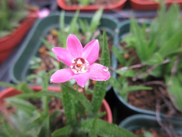 雨あがりの朝のロードヒポキシス(アッツザクラ)は雨のしずくをたたえて輝いています。