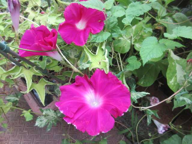 朝顔、雨がふるようになって大きな花がたくさん咲くようになってきた。