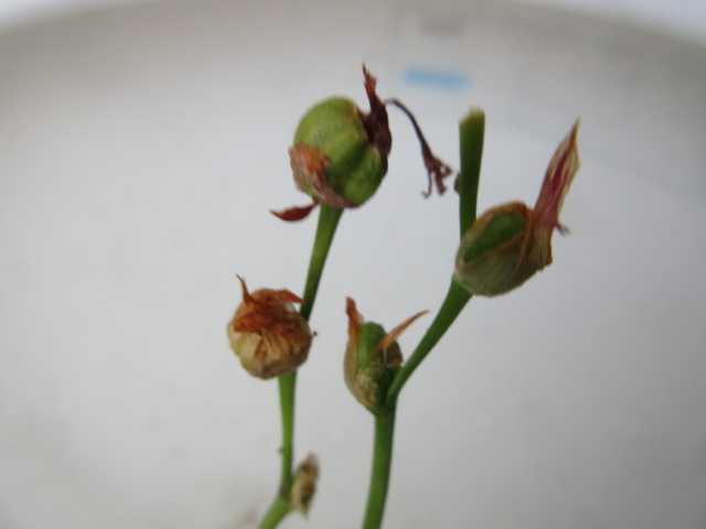ゲイソリザ・インフレクサ、左の丸い実は多弁咲きのもの、ふつうは子房が3室に分かれるのですが