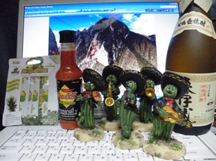 久々に楽天に記事を書くことにする。写真1枚しかないからね。さてメキシコの土産と聞いて思いつくのが、サルサソース(タバスコみたいなもの)かテキーラぐらい。メキシコの駐在員に聞いても他に出てこなかった。テキーラは瓶入りで、ロスでワンストップするから手荷物として日本まで持って帰れない。昔インドでラムをスーツケースに入れて帰ったらこなごなに割れていたことがあったので再び試みようとは思わない。 で、今回のメキシコ土産はこうなった。左から、サボテンジュースの素;スーパーでウチワサボテンの葉っぱ(勿論とげ抜き)が売っていて、そこにこれもあった。お土産として上げた人によれば、一緒に入っているパイナップルの味が勝っていてサボテンの味がしなかったようだ。別の機会にウチワサボテンの葉っぱ(茎?)を食べたけど、草っぽい味しかしないので、サボテン味は負けてしまうのだろう。まあ、話のネタには丁度良い。 サルサソース;Hot!と書かれたプラスチックケースの小瓶を、こちらもスーパーで購入。スーツケースにしまっておいても割れなかった。こちらはどんな味だろうか???サボテンマリアッチ人形;これは自分用。擬人化されたサボテン5体からなる、レストランで音楽を演奏するマリアッチ(音楽バンド)。580ペソ(約4300円)と高くて悩んだが、可愛いので買ってしまった。サボテンの寄せ植えに飾ると面白いかな? 焼酎 森伊蔵;メキシコのお土産ではないが、プレミアムが付いている焼酎がJAL機内販売では何故か定価で買えてしまうのでついつい買ってしまった。昨日飲んだところ、深みのあるすっきりした味わいで美味しかった。ま、JAL支援でもあるしね。 で、近況。メキシコでの仕事が終わったけど楽にならない。報告書を書くのだが、細心の注意を払って書いている。つ、疲れる。今日は10時まで会社にいた。。。体、持つかいな。。体重;基準値比+0.6キロ、前回比ー0.4キロ。ふー、少しずつだが減りだしたかな?株;-27%。NTTドコモがもうすぐプラマイゼロになる!うう、嬉しいです。先物は二度売り建てたものの、相場の上昇機運に逆らえず損を出して撤退。下げのタイミングをどこで計るかが難しい。誰かおせーてぇ。アメリカ株は相変わらず好調。円安に振れているし、嬉しい限り。この円安はどこまで続くのかいな。多肉;寒すぎ。急遽、外にあったものを全て取り込み、再び多肉屋敷に変身!さっきテレ東、ワールドビジネスサテライトを見ていたところ、多肉植物のフーディアに空腹感を解消させる効果があり、製薬会社が製品化して莫大な利益を上げたそうな。フーディアでぼろ儲け!!!フーディアの写真を探したが見つからなかった。