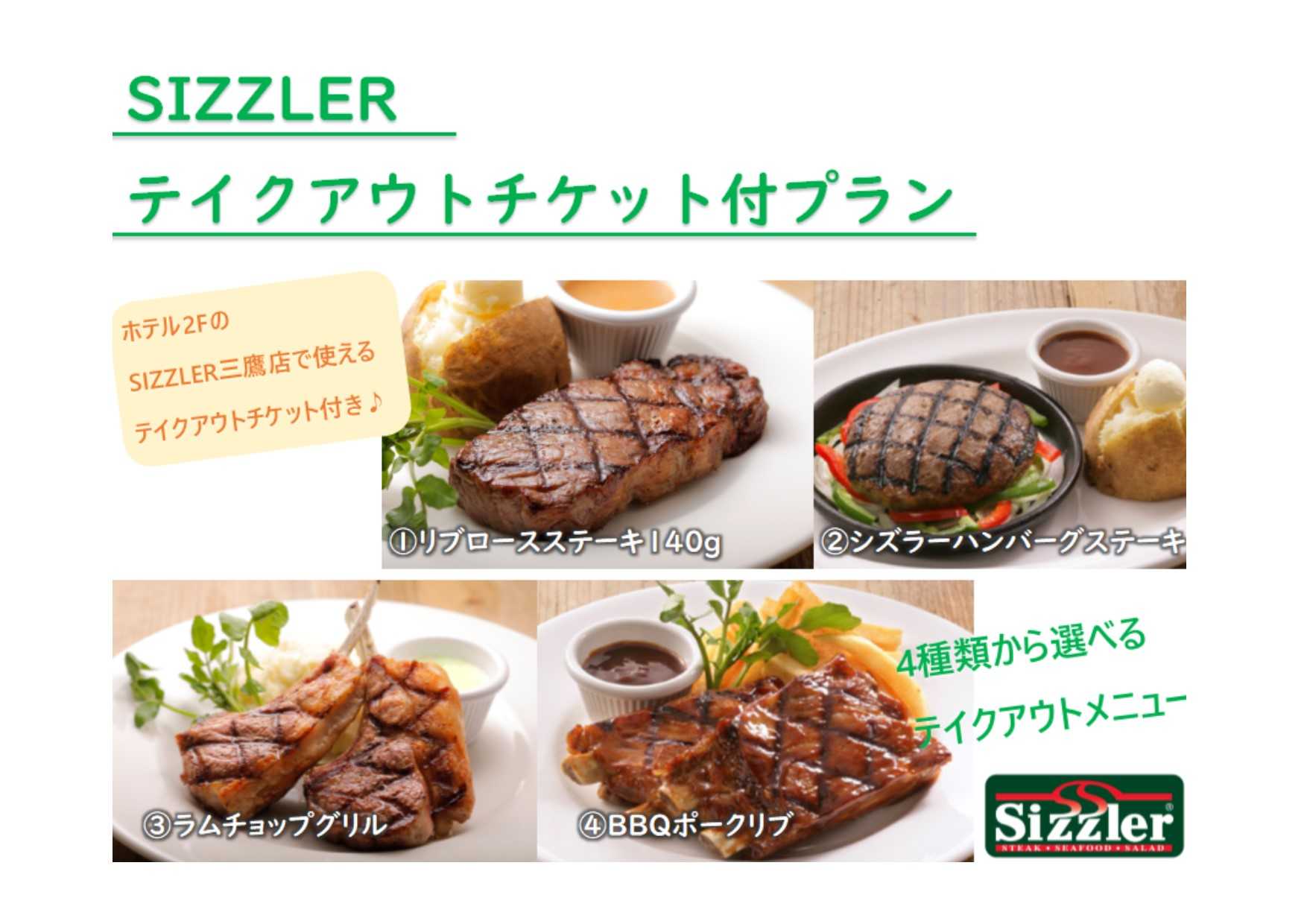 ホテル2階にございますレストラン、シズラー特製のテイクアウトメニューより、1名様ご1泊につき1品と交換できるチケット付きプランです。