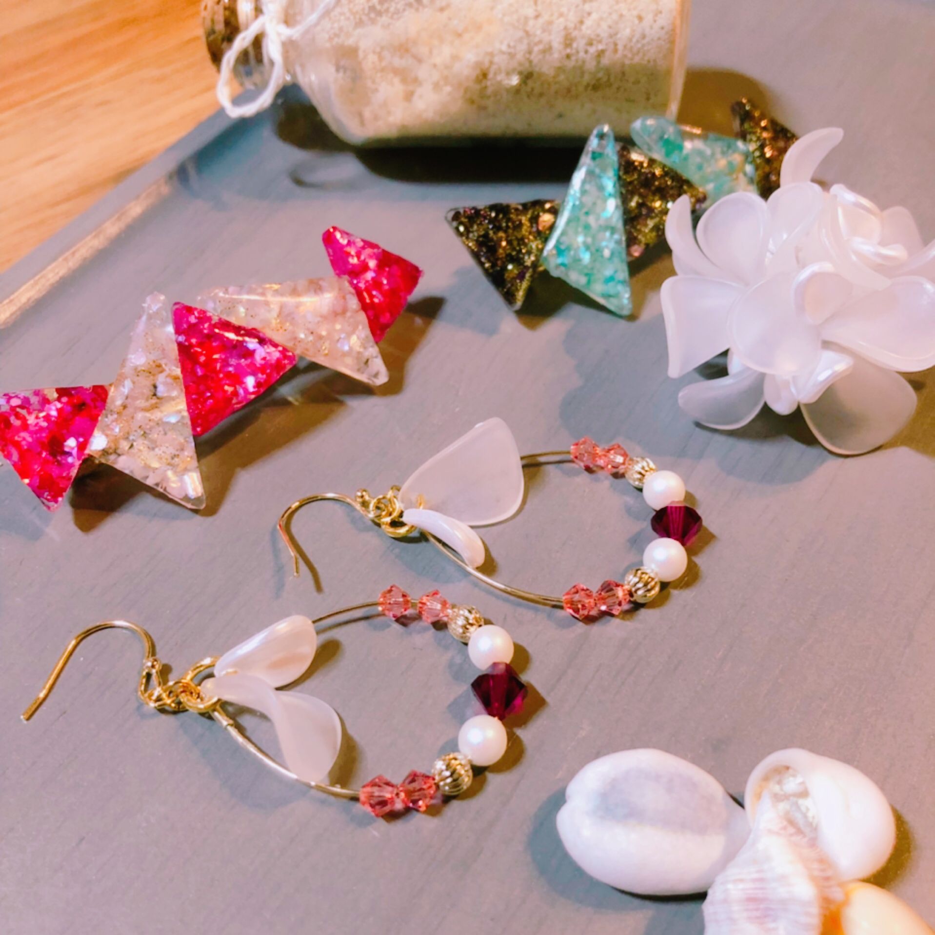かっちゃんが寝ているこの時間帯、、、毎回中途半端な時間に更新して申し訳ない出産してから自分の趣味が、なくなってしまった。(笑)出産前は、旅行、カメラ、ハンドメイドなど、ちょこちょこかじっていましたがこどもがいると、簡単に旅行できず、カメラ持ちたいけど、抱っこしながら撮れない、時間がかかり、細かい部品がある作業なので、誤飲が怖い。。。。と、、、出産すると何かを失い、悲しむこともありますが、でもそれ以上に大きなものを得るような気がします。子育てしながら、手軽な趣味なにかあるかなぁ~?この前、ノンストップという番組で、虻ちゃんが多肉植物を植え替えていたんです。すごく楽しそうちょっとしてみようかな。。。。と考えているところです今日は、出産前に作ったアクセサリーを載せたいと思います。いろいろ集めるものがあると思いますが、不器用すぎる人でも意外に作れちゃいます!デザインさえ決まれば、すぐできちゃいますよ!ただ、細かい部品が多いので、小さなお子様がいる家庭は要注意!!!!バレッタやピアス、ポニーフックなど手軽に作れちゃうんですね!ポニーフック、、、めっちゃはまっていました(笑)レベルとしてはすごい初心者なんですけども、キラキラしたものをみるとテンション上がりますねどんどん作り方を覚えてきたら、市販で売っているアクセサリー類がどのように作られているか、見ちゃうようになります。「え?これただ接着剤で貼り付けているだけなのに、2,000円もするの!?」とかね。皆さんは、ずっと続けている趣味、結婚してから、社会人になってから、出産してから趣味ができたことありますか?挑戦という意味でも、ぜひ試してみてください^^ここまでよんでいただきありがとうございます。りこまむ。より