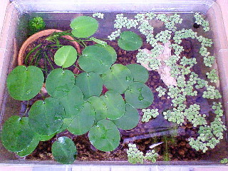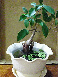 ウチには植木鉢が有り余っている。マンションがガーデニング禁止になる以前はちょっとだけベランダガーデニングに凝っていたのです。先日、「メダカおやじ」のBlack Knightsさんの日記に植木鉢の穴の塞ぎ方があったので早速実行してみました。大きさは金魚鉢サイズです。ちょっとしたビオトーブ風にしてみました。簡単に持ち運べるので、時々ベランダに出そうと思います。ちょっとガジュマルがでかいなあ~。ハイドロで育ててたんだけど、意外に育つものですね。何を作っても、どうもバランスが悪いです。子メダカがベランダデビューするまでの短期間ここで遊んでてもらおうと思ってます。