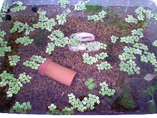 先日ボトル2号に入れたジャンボタニシの仲間ゴールデンアップルスネイル(長い)ですが、とうとう隔離されてしまいました。このコ達は物凄い暴れん坊で、苦労して植えた水草を全部引っこ抜くし、せっかく生えた根っこをかじっちゃうし、水草そのものをどんどん食べちゃう。調べた所、お腹がすくとメダカを食べる事もあるらしい。それに何より水を濁らせるんです。ボトル2の水が汚れた原因はこのコ達だったんですね~。試しにこのコ達を別ビンに移してみたら、2日目にはもう水が白濁してしまいました。何の知識も無しで、生き物を購入しちゃいけませんね。そういえば以前TVでジャンボタニシの大繁殖が問題になってる地域があるってやってたような・・・捨てちゃう人もいるのかも知れないね。うかつに川に放すわけにもいかないし、見てるとなかなか面白いので、このまま飼育してみます。そのうち、タニシ日記が出来るかもしれない。