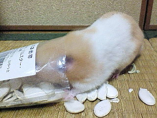 相変わらずダンボールかじりに夢中です。必ず仰向けにひっくり返ってカジカジします。ハムがいる部屋はあちこちダンボールで囲ってあったり家具の隙間に雑誌が挟まってたりします。見栄えも悪く、変な部屋なんだけど、このかじりっぷりで家具をかじられたら、と思うとダンボールでカバーするのも仕方ないですね。昔、ケージで囲ってハムを散歩させてた時もあったんだけど当時飼っていたハムに畳をかじられまして・・・それ以来ダンボールのお世話になっってます。かじる事でストレス解消してるんですかね?ダンボールじゃ歯は削れないと思うけど、でも小屋にあるかじり木には目もくれない。やっぱり穴を開ければ外に行けると思うのかな。よっしーは夢中だけど、かじった後のゴミ掃除が面倒です。