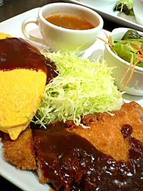打ち合わせの移動ついでのランチに、お気に入りの洋食屋 ロンシャンに行ってきました。いつもは仕事帰りのディナータイムにいっているので店内はちょっと暗めの雰囲気なのですが、今回はランチタイムだったので、明るい雰囲気でいつものお店とはちょっぴり違う感じ。メニューもいつものものがなく、ランチタイム用のちょっぴりお得なセットが多めです。そんな中で、お得なハンバーグを頼もうかなぁなんて考えていたら、隣に座っている人が食べていたメニューに心奪われ、一緒だった先輩ともども同じメニューを注文(笑)それが、これ「オムで味噌カツ」かなりふざけた名前ですが、デミグラスソースのオムライスと味噌カツのいかにも名古屋的ながっつりメニュー。ここのお店はオムライスもとても美味しくて大好きなのですが、夜のビーフカツレツが美味しいと思っていたら、とんかつもやっぱり美味しかった♪しかし、見た目どおりのしっかりメニューなので完食できず、、、(無念)ちなみに、お値段は\1480で、このメニューに関しては夜もやっているみたいです。腹ペコなときに、名古屋駅広小路口を通りかかった際には、是非っ♪