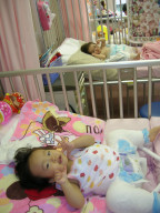 おあつうございます。すっかりご無沙汰してしまいましたが、皆様、お元気ですか? ☆☆1枚目の写真は、滋賀の病院でギブスになってからのコトさんです。隣のベッドにいるのが一緒に頑張ったよっちです♪ 2枚目の写真は、お世話になった8号室のみんなと撮った思い出の写真です♪☆☆ 早いもので退院してからもうすぐ1ヶ月です。 水野病院へも2回ほど検診へ行きまして、鈴木先生と久しぶりに再会してまいりました。 滋賀で撮ってきた写真を先生に見せると、とても懐かしそうににしていらっしゃいました。 8月7日で瑚都さんは1歳8ヶ月になりました。 1歳半を過ぎてからのギブスなので、鈴木先生は7週間のギブス生活を提案してくださいました。この時期のギブス生活は確かに大変だけど、今が大切な時期なので、瑚都さん、頑張ってます! 17日に装具屋さんの採寸取りの為、水野病院へ行ってきます。 順調に行けば、31日に「ギブスカット→装具」の予定です。 もうここまできたらあせらずゆっくりいこうと思います♪ 最近瑚都さんは、ギブスでのハイハイがすさまじく上達し、ちょっとした段差なら上手にクリアしていきます。 噂には聞いていましたが、子供の順応力のすごさに驚かされる毎日です。 皆さんも、この暑さに負けないよう、お気をつけくださいませ。 **おまけコーナー**今、我が家の食卓で毎晩出ているものがゴーヤとミョウガ。わたしもとうちゃんも大好きなんですよね。ありがたいことに、とうちゃんの実家で採れるから、いつも新鮮なものが食べられます。楽天でも美味しそうなのが売っているのね~。毎日毎日暑くて暑くて沢山汗をかきますが、やっぱりプチバトーの洋服はしっかり汗を吸収してくれると思います。