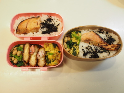 今日も長女は部活で六時出本日はちょっと遠くの中学校で錬成会です。思いっきり暴れてこーーい!!笑今日のお弁当。昨日の鮭の西京焼き(わたしが我慢し弁当に回しました)、ひじきふりかけ、ほうれん草入り卵焼き、大豆とほうれん草の和え物、冷食(ごめん!!( ̄▽ ̄;))。わっぱは母用。父は、自治会の用事ででかけるというので母だけに作成。これから様子を見に行ってきますー。昨日呟いていたサンドウイッチは、夕飯用に作ってこようと思います。さて、こちらの蒸し大豆。よつ葉生協さんの新商品なのかな?!はじめて頼んでみたけど、ふっくらしていてとっても美味しいそのまま食べてもいいし、今日のおかずのようになにかとコラボしてもいいし♪大変気に入りました。かわいいコアラパンは、仕事帰りに父ちゃんがかってきてくれたもの。スーパーのパン屋さんで半額だったそうですΨ( ̄∇ ̄)Ψちびたち、大喜びでした。笑ランキングに参加しています。どこかの三姉妹を彷彿とさせるこちらのモンキーちゃんたちを、ポチッとして頂けると嬉しいです(*^_^*)にほんブログ村