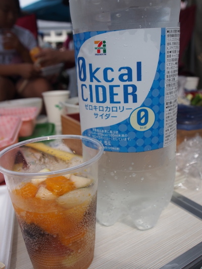 ネットで見つけたのですが、凍らせたフルーツ(お昼頃はいい感じに溶けています)に、冷やしたサイダーをかけるだけ。