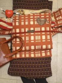もうすぐ、バンレンタインディーですね。この時期の和服の柄として、ハートとチョコレートは、面白いと思いまして、寄せ集めで、無理やりコーデしてみました。明日のおでかけの為にです。バレンタインコーデ 案1 …赤の帯〆。茶の■■■帯留め 下の写真に帯締め2本おいています。バレンタインコーデ 案2 …薄茶の帯〆。茶の●●●帯留め バレンタインコーデ 案3 …黒茶の帯〆。案1と案2と案3と迷っています。着物と帯は決まっています。まぁ、どれも似たり寄ったりですが。。。自分では、案1・赤が可愛い、でも又、赤?案2・個性的でも、ボケている。案3・黒く締まる感じでも面白さに欠ける皆様でしたら、どれにするかな?と気になります。帯揚げは、エルメスのシルクプリーツスカーフ です。果物柄が、入って フルーティーチョコ のイメージです。何かの本でスカーフを帯揚に使用出来ると記憶にありましたので、チャレンジです。型の、シルバー系の髪留めです。連型の、ストラップです。根付仕様にします。ハートの中に顔があるのですが、見えませんね。可愛いのよ♪和と洋のコラボです。モダン系にしてみました。ブログのトップページにバレンタインコーデしてみます?と、色々みていく内に、急に、盛り上がりました。スカーフは若い頃(バブル期)のものです。10年ぶりに使用します。懐かしいわぁ。あえて、バレンタインコーデの為に購入はしていなかったので、どうなるかと思いましたが、寄せ集めでも、なんとか出来ますね。濃茶着物は単衣ですが、この際、暖冬ですし、下着を暖かくして、着てみちゃえ。帯は薄茶でミルクチョコ色です。とりあえず、今年の バレンタインは これ!来年は、もうちょっと凝ってみたいです♪スカーフを集めてみました。綺麗ですね♪